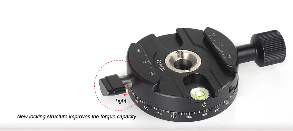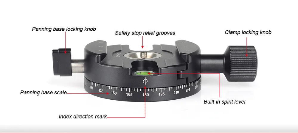 Весы с гравировкой лазером, указатели указателей могут точно измерять любые отклонения угла во время каждой съемки в горизонтальном вращении, выровненная шкала быстроразъемной пластины может точно контролировать узловую точку во время панорамной фотографии в различных фокусных расстояниях. Поэтому панорамная фотография может быть более точной и высокой эффективностью.