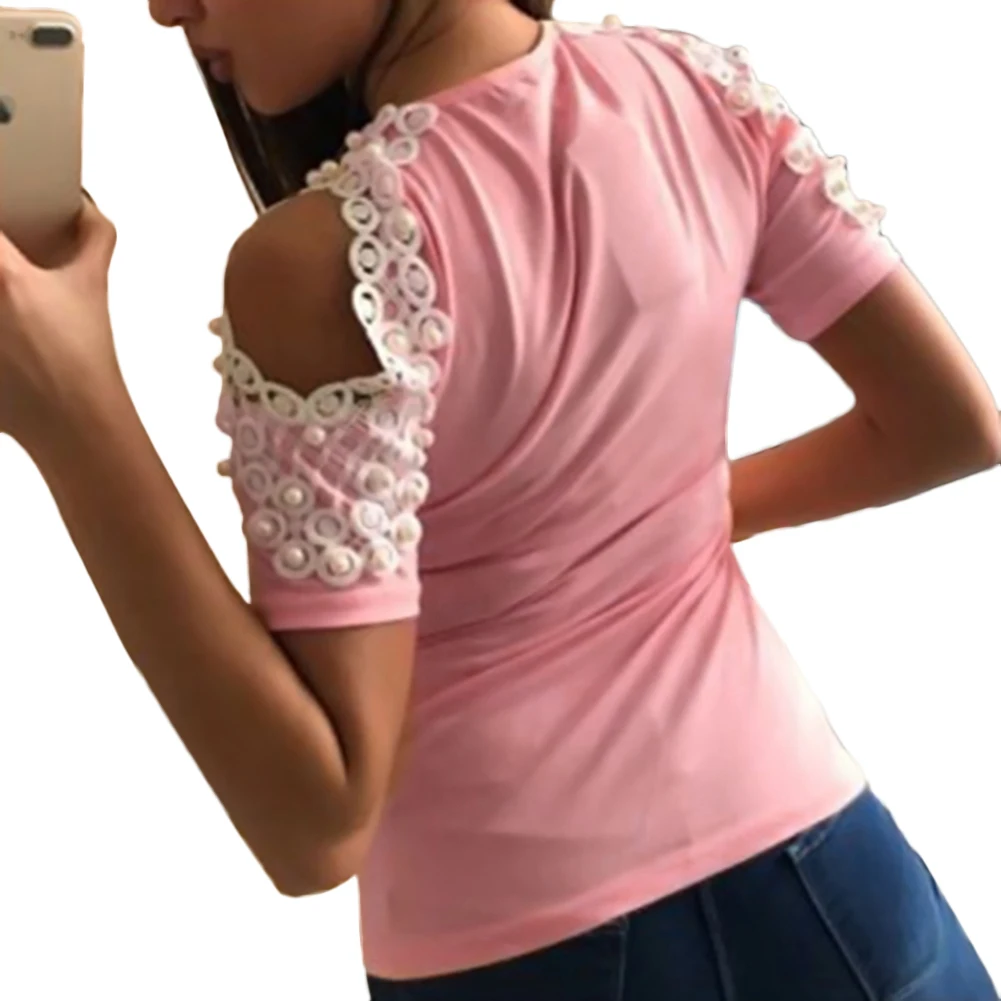 Размеры: S, M, L, XL, 2XLОсобенности:Кружевная расшитая бисером футболка без бретелек с короткими рукавами, круглым вырезом, эластичная трикотажная хлопчатобумажная ткань, базовая футболка, сексуальный Повседневный Топ, подходит для покупок, отдыха и дома и т. д.
