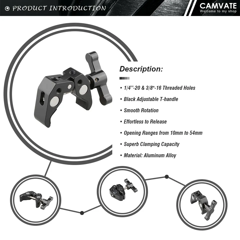 Супер Зажим специально поставляется с изысканной Т-образной ручкой, которую вы можете удобно держать, и Трещоточный рычаг предназначен для плавного вращения и экономии усилий. Он оснащен резьбовыми отверстиями 1/4 "-20 и 3/8"-16 на зажиме, что обеспечивает монтажные точки для таких аксессуаров, как Шарнирный рычаг, шаровая Головка, монитор, светильник vedio. Кроме того, отверстие челюсти колеблется от 10 мм до 54 мм, так что его можно легко установить на водопроводную трубу, перила, столб, полку, стол, И ветки и т. Д.