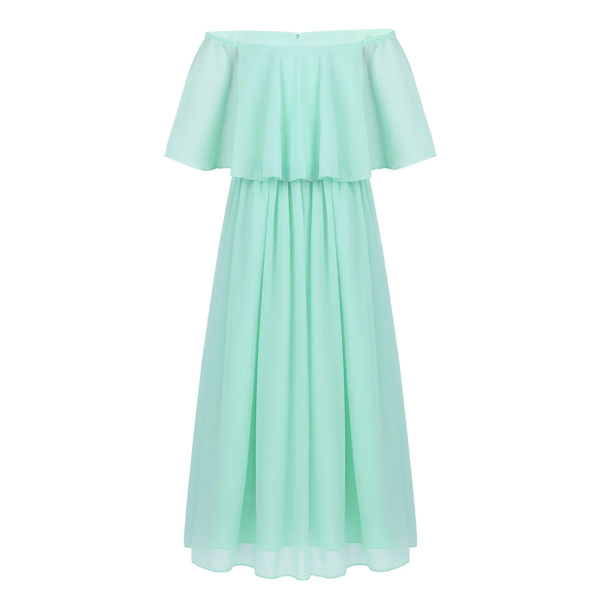 Дизайн с открытыми плечами, лиф с многослойной оборкой, высокая талия. Скрытая молния сзади.