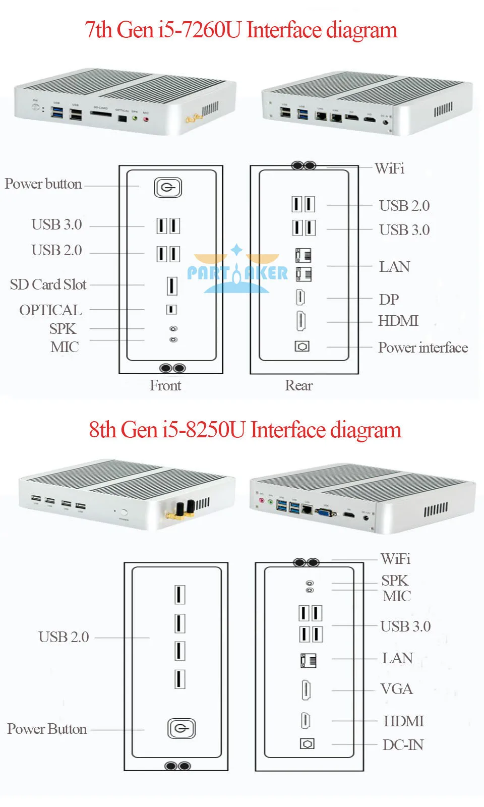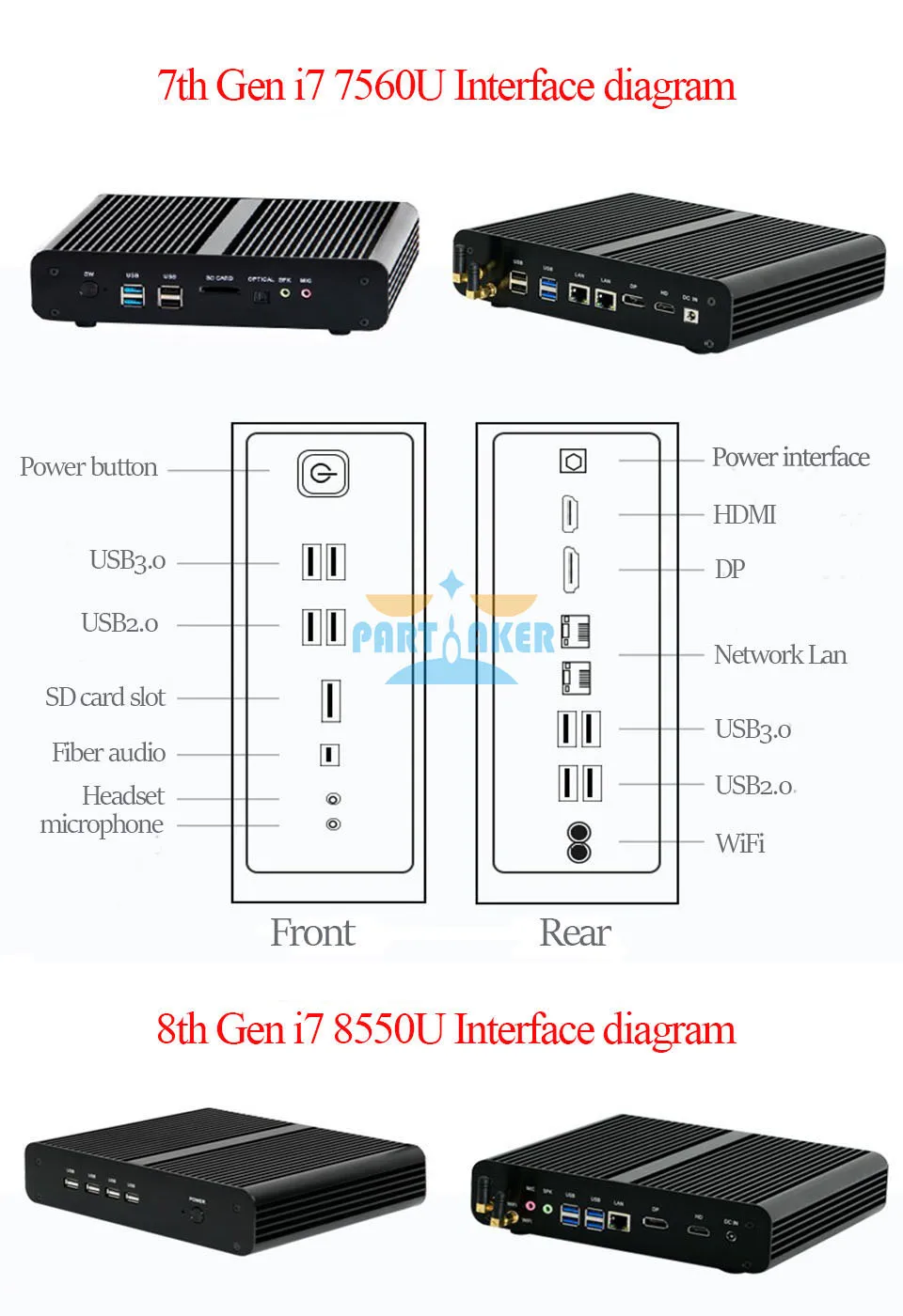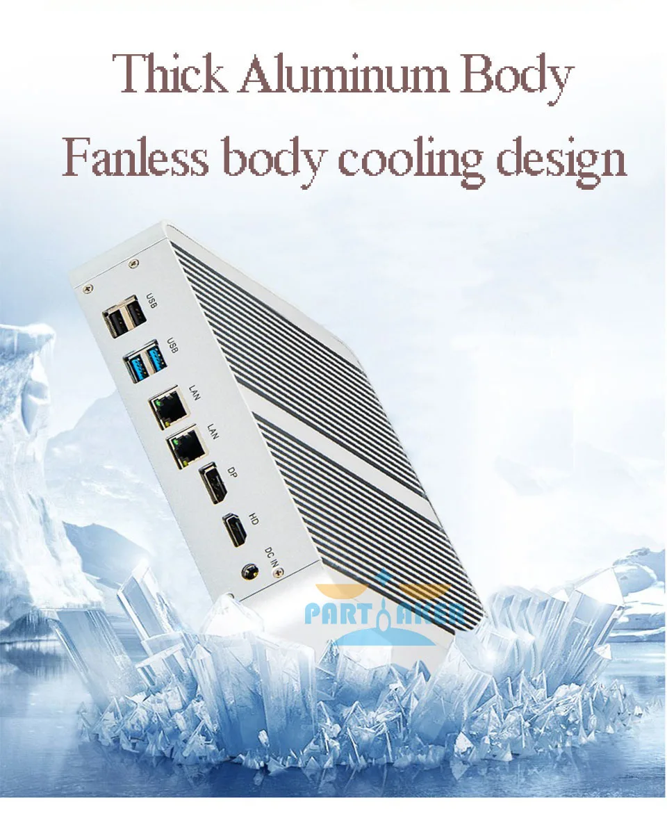 Разработан с 2 * LAN + DP + HDMI + 4 * USB 3,0 + 4 * USB2.0 + 1 * оптический + 1 * SD кардридер + Spk + Mic, промышленный эстетический дизайн и разумная схема интерфейса. Поддерживает автоматическое включение после отключения питания.