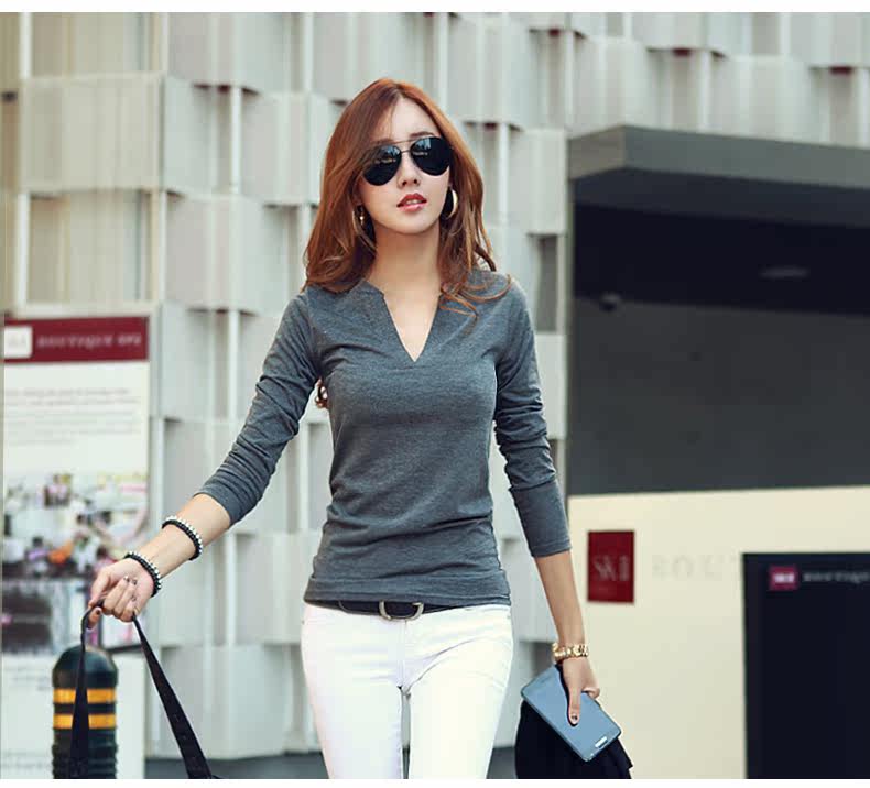 Женская футболка OUMOWEI, новая футболка с v-образным вырезом и длинными рукавами, бархатная утепленная приталенная рубашка, Женская Осенняя рубашка
