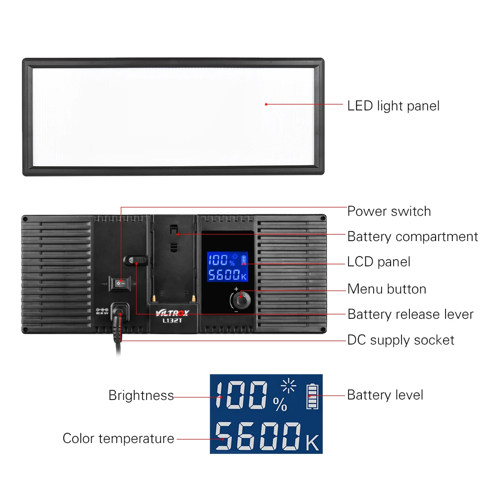 --- Он обладает высокой яркостью, естественным и мягким освещением, регулируемой цветовой температурой (3300K-5600K). ЖК-дисплей высокой четкости обеспечивает четкость рабочего интерфейса. Он имеет два вида режимов питания (литиевая батарея и мощность постоянного тока). Вы можете регулировать яркость и цветовую температуру бесступенчато.