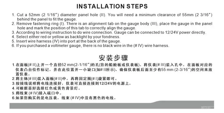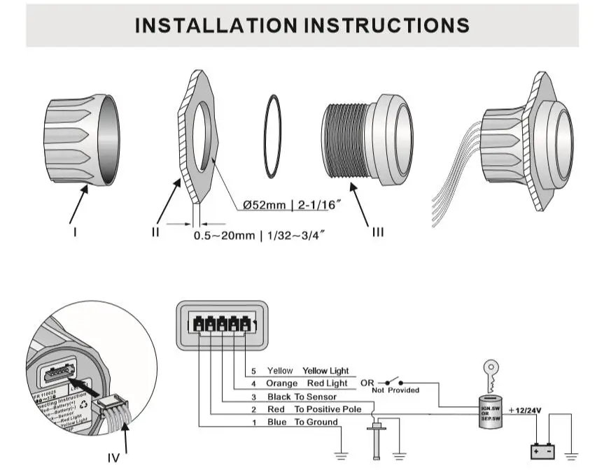 Подключение: красный-аккумулятор (+ 9-32VDC) синий-аккумулятор (-) черный-сигнал оранжевый/желтый-подсветка (+ 9-32VDC)