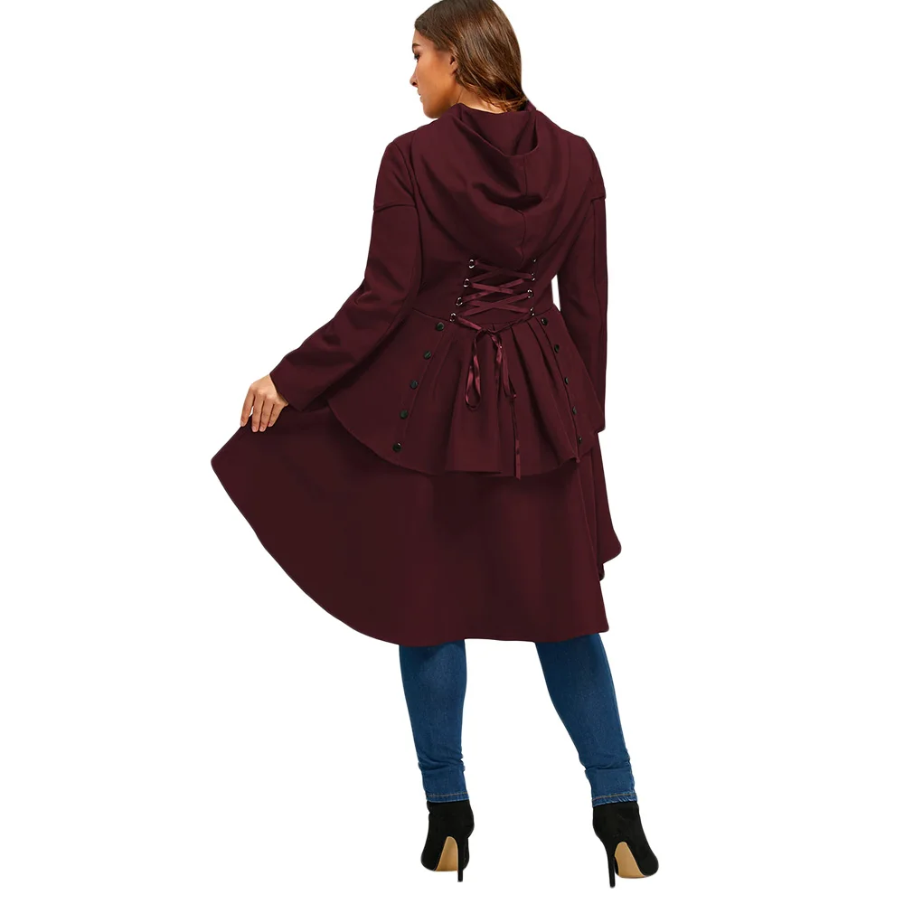 Модный Тренч больших размеров со шнуровкой, с высоким низким капюшоном, женская верхняя одежда на Хэллоуин, Осеннее многослойное готическое пальто с высокой талией, Женское пальто