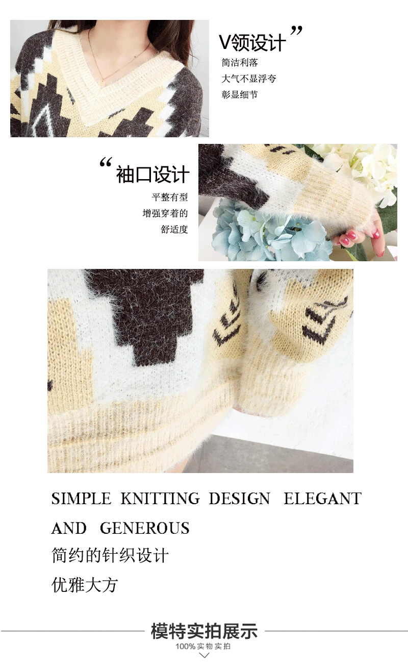 Autumn Winter Knit Pullovers Sweaters New Hot Sales Women Preppy Style Girls Blue Brown Knitted Printed V Neck Sweater Tops 1078