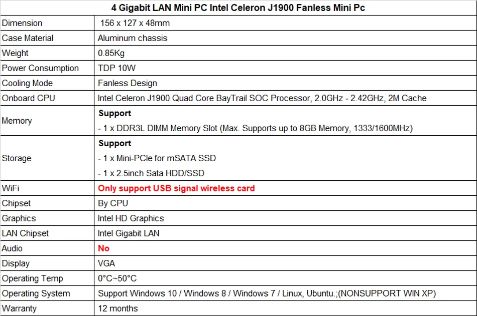 4. Стабильная: новейший Intel Celeron J1900 + Bay Trail + Intel HD Graphics + безвентиляторный Профессиональный пассивный охлаждающий чехол из сплава, возможность работать 24 часа в сутки;