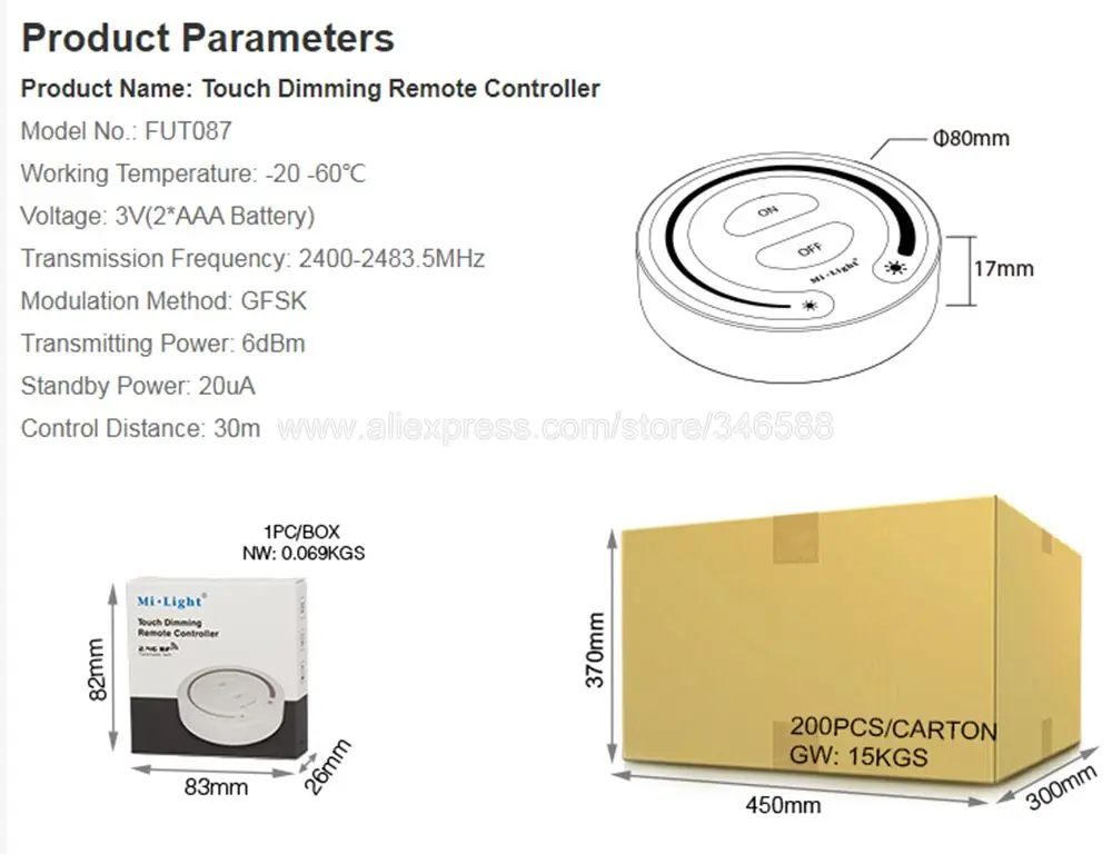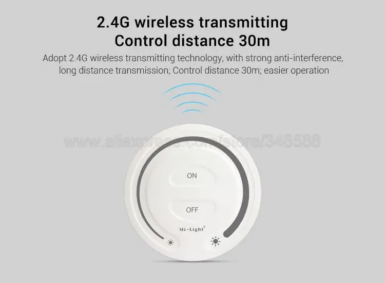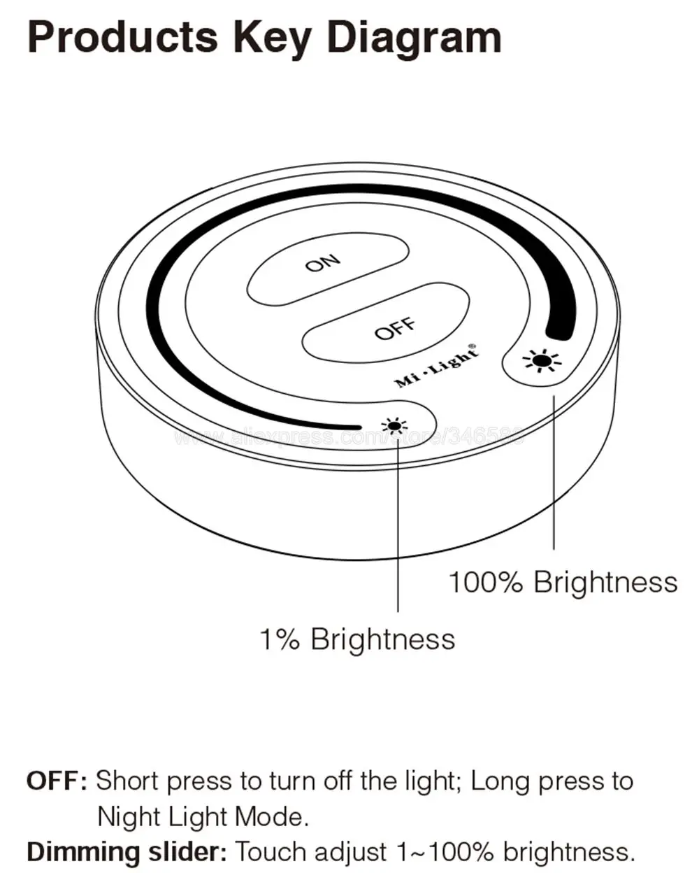 Это только пульт дистанционного управления, может работать с Milight dimming светодиодный или потолочный светильник напрямую, или работать с одноцветными полосками с контроллером milight single color strip.