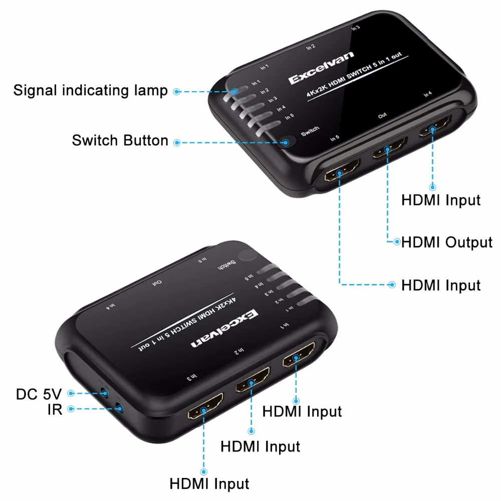 Особенности | Поддержка аудио: Поддержка Dolby TrueHD, DTS-HD Master Audio 7.1CH Поддержка разрешения: поддерживает видео с высоким разрешением, разрешение HDTV до 2160 p, разрешение компьютера до 4 K * 2 K легко достигается Входной интерфейс hdmi: 5 входов hdmi Интерфейс выхода hdmi: 1 выход Поддержка: Поддержка двустороннего переключателя: Автоматический Инфракрасный пульт дистанционного управления; ручной кнопочный переключатель Совместимость: Совместимость со стандартами HDMI 1.4a, CTS 1.4a, DVI 1,0 Поддержка: Поддержка 16-битного глубокого цвета; высокая производительность до 2,97 Гбит/с Другие особенности: совместимость с HDCP; ИК беспроводной пульт дистанционного управления |
