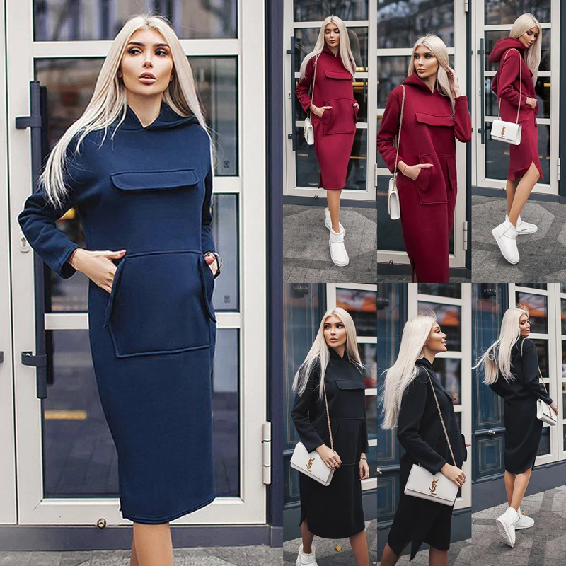 Цвет: черный/красный/синий Дизайн: с капюшоном, джемпер с карманами Посылка включает в себя: 1 женский джемпер/платье Примечание: Существует разница в 2–3 см связанная с измерением вручную.