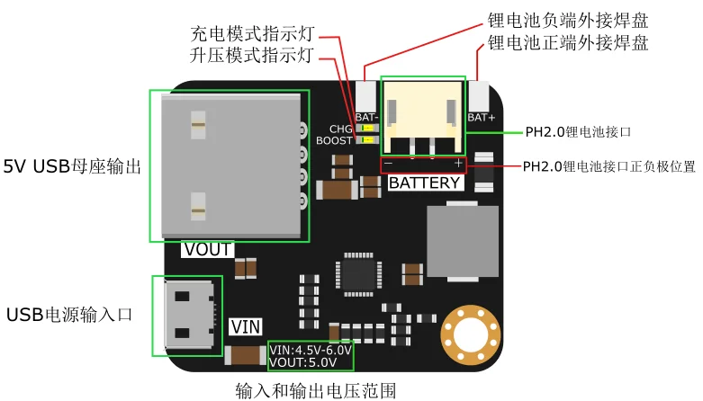 In many applications, we will use lithium-ion batteries as our power solutions. In this kind of plan, the first two technical difficulties to be solved are the boost and charging of batteries. These two points are prerequisites for ensuring continuous and stable operation of the system. Traditional boost and charge are usually divided into two separate parts to perform, circuit construction will be relatively cumbersome. The MP2636 power management module is a small volume charging / boosting two in one module. When there is an external power supply, the battery charges automatically. At this time, the CHG lamp is always on. When there is no external power supply, the lithium battery is used as the power supply to boost to the output. At this time, the Boost lamp is always on. Be careful: When powered by an external power supply, the output voltage is not stable at 5V, but slightly lower than (about 0.1V) the external power supply. Input voltage is not more than 6V, when the input voltage exceeds 6V, the chip will stop working, input voltage should not exceed 16V, otherwise the chip may burn out. Charging mode input voltage (VIN):4.5-6.0V Boost mode output voltage (VOUT):5V Suitable for battery voltage: 4.2V (3.7V lithium battery full 4.2V) Charging mode large charging current: 2.5A Boost mode large output current: 2.5A Switching frequency: 600KHz Charging mode efficiency: >90% Boost mode efficiency: >90% Supporting battery overcharge protection Temperature protection: over 150 C, automatic power failure. Size: 35 x 30mm Weight: 12g