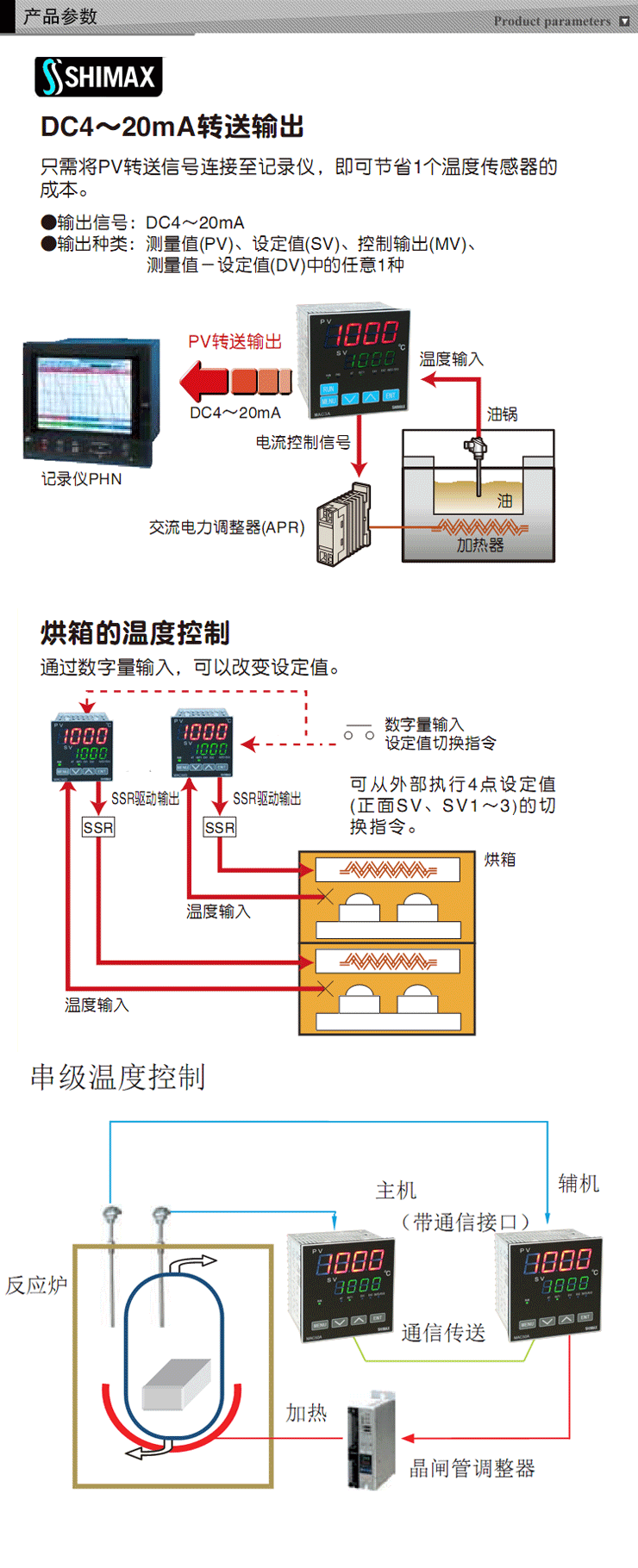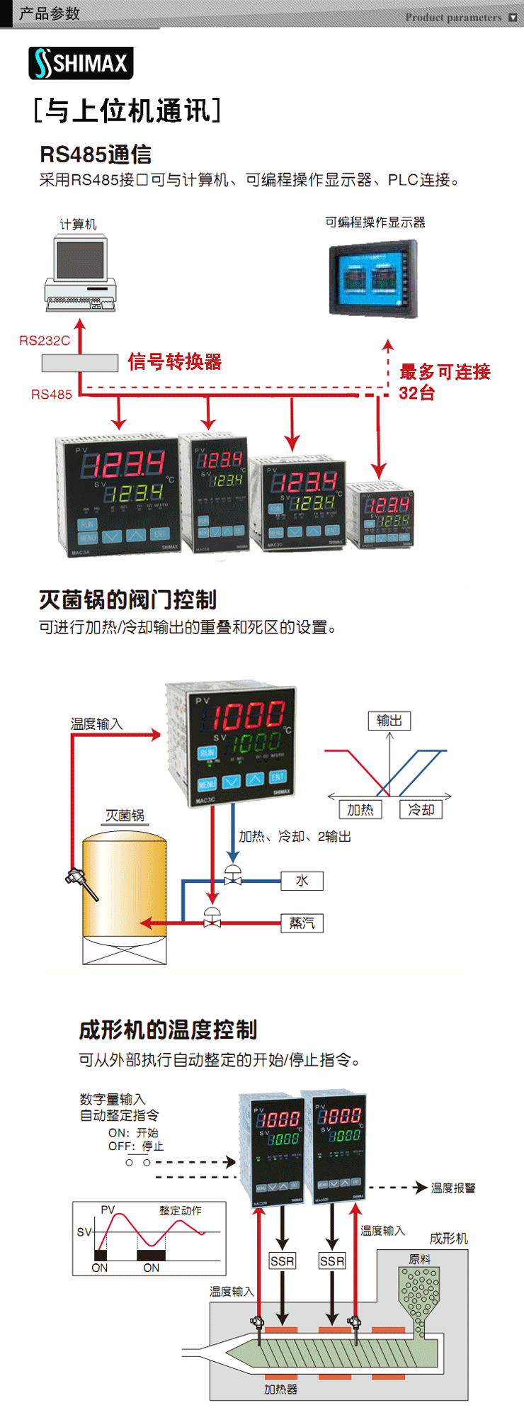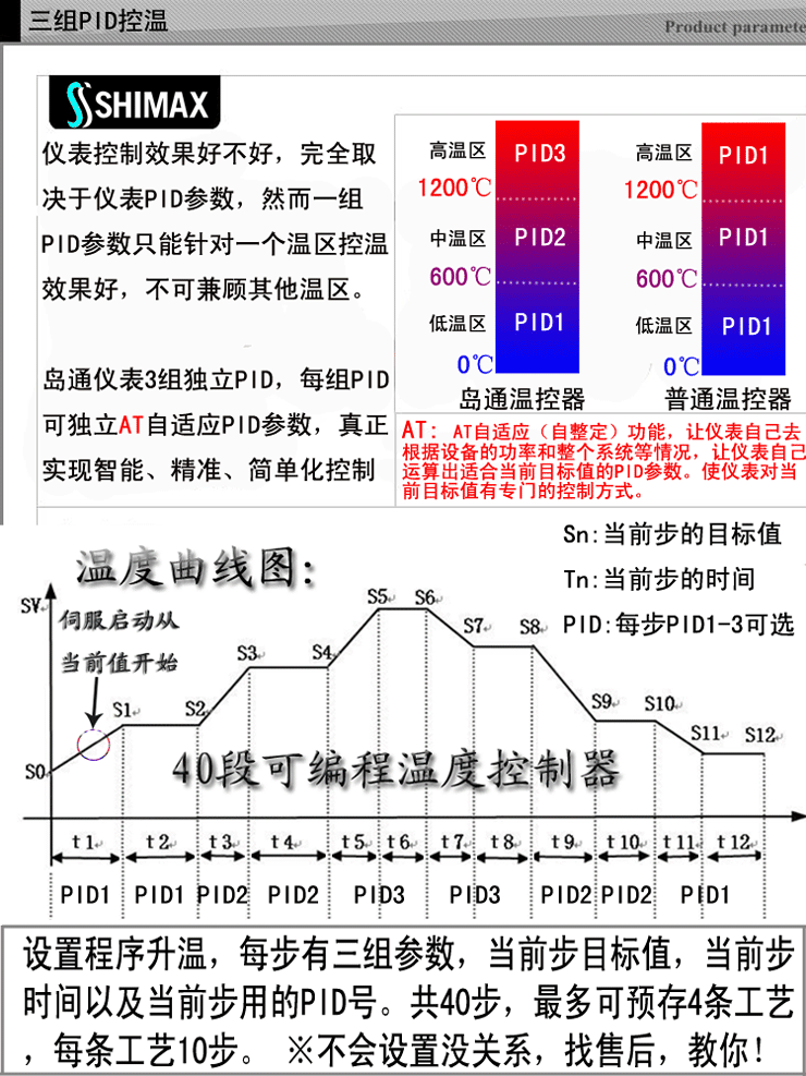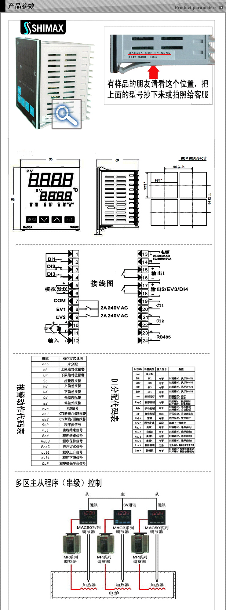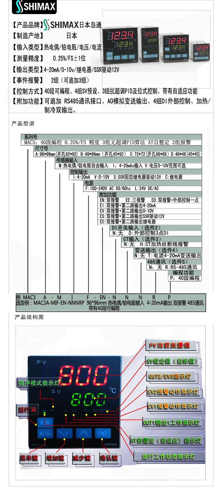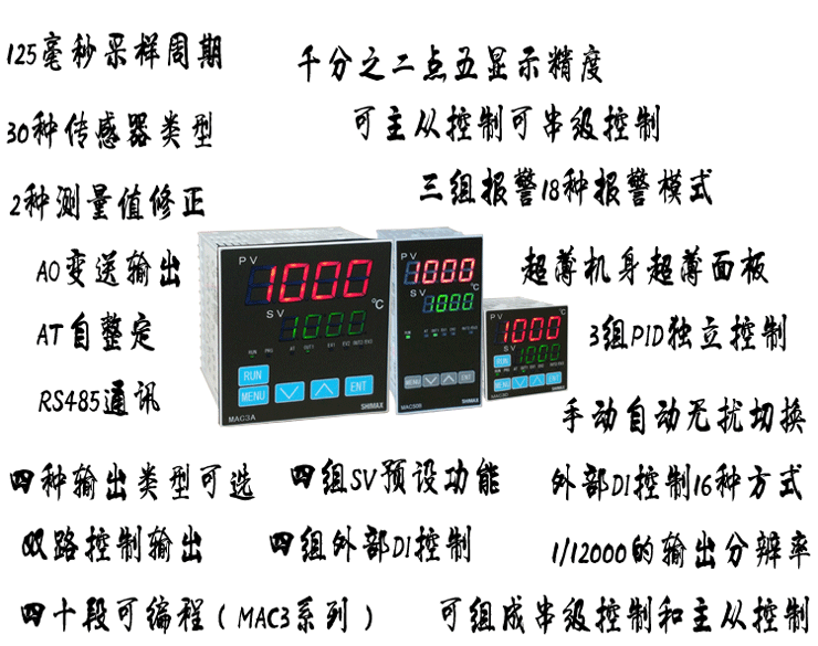 Ультратонкий фюзеляж,Интеллектуальный эксперт и двойная степень свободыПИДАлгоритмТри группы являются независимыми.ПИДПараметры,ATСамонастройкаРучная работа/Автоматическое управление переключением без помех,Регулировка выходного предела и медленного запуска.ЧетыреSVУстановите значение.3Выход дорожного события,4ДорогаDIВход,40Программируемый шаг (4Кривая бара)Выход аналогового передатчика,Функция дистанционного управления питанием цифровой связи.Период выборки:250 мс.Уровень защиты передней панелиIP66,RS485(MODBUSПротокол связи.Сигнал тревоги может быть установлен нормально ВКЛ или ВЫКЛ,ВыходOUT1Разрешение питания:1/120001. Выбор типа: MAC3A-МIF-EN-DNNRPУказывающий инструмент96*96 мм панель,Термопары. Платиновое сопротивление. Милливольтовая передача напряженияВведите,4-20MA выход,Две сигнализации,Три набора входов внешнего управления,С RS485 интерфейс связи, 40-сегмент возможности программирования устройство.