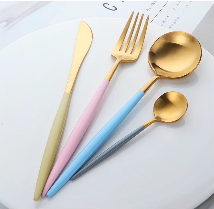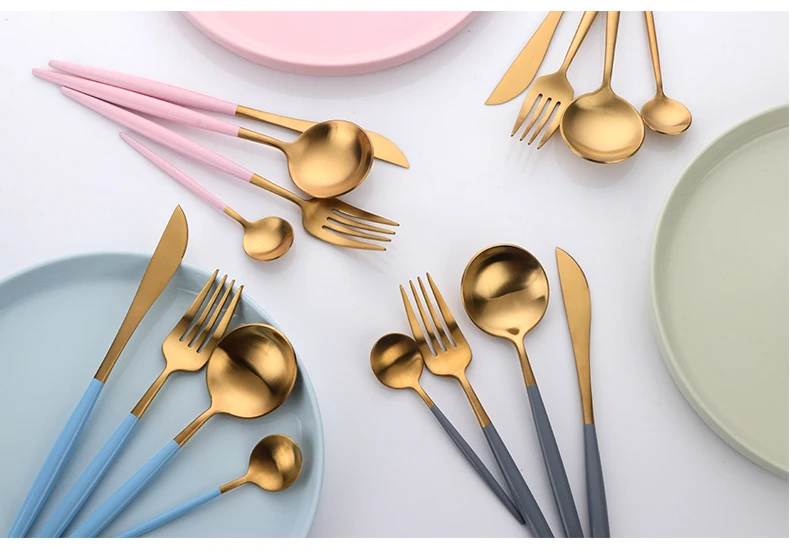 Посылка включает в себя: 1 комплект = 4 шт. (1 настольный нож + 1 Настольная вилка + 1 Настольная ложка + 1 чайная ложка)