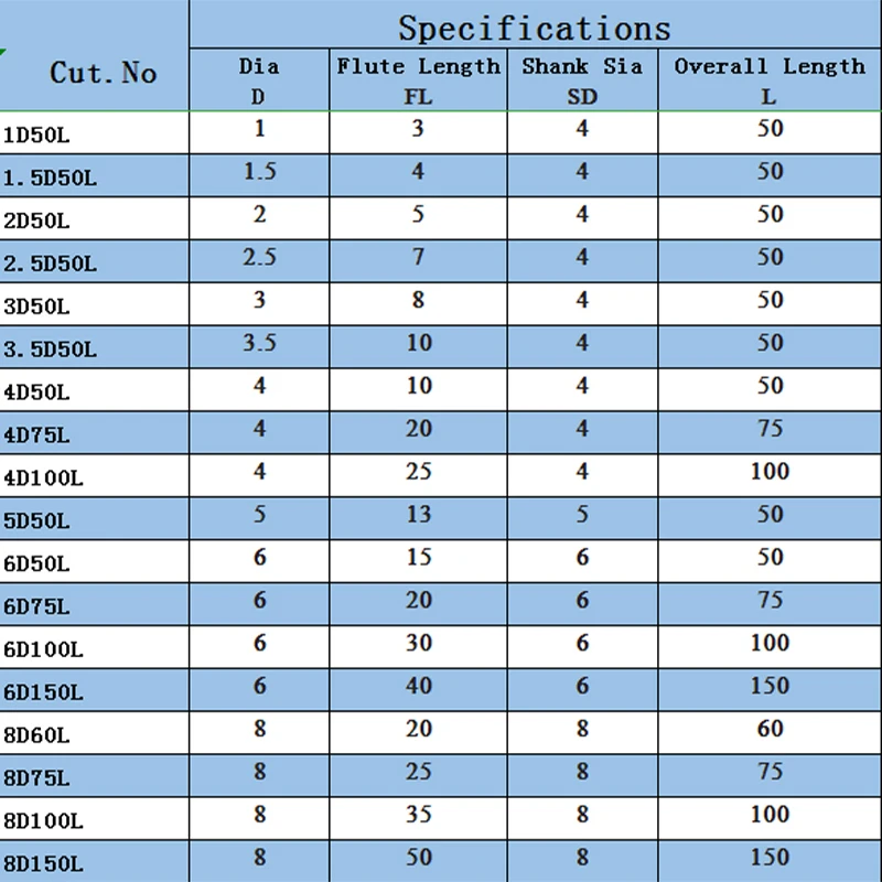Допуск диаметра торцевой мельницы 1 < D≤ 6-0,010 ~-0,030 6 < D≤ 10-0,015 ~-0,040 10 < D≤ 20-0,020 ~-0,050 Параметры резки Vc = 150 (120-180) м/мин Ap = 1/3D(1/8-1/2D) Ae = 1/2D(1/4-1D) Fz = 0,15 мм (0,02-0,2) Пожалуйста, отрегулируйте параметры в соответствии с материалом и твердостью заготовок. Применение: 1. Рекомендуемая резка HRC50 - 55 градусов внутри стального материала. 2. Подходящий материал обработки: углеродистая сталь, легированная сталь, инструментальная сталь, закаленная и закаленная сталь и стальные детали hrc55-below. Советы по безопасности: 1. Поврежденный продукт не используется для людей до 18 лет. 2. Изделие используется только для промышленной резки не опасных изделий.