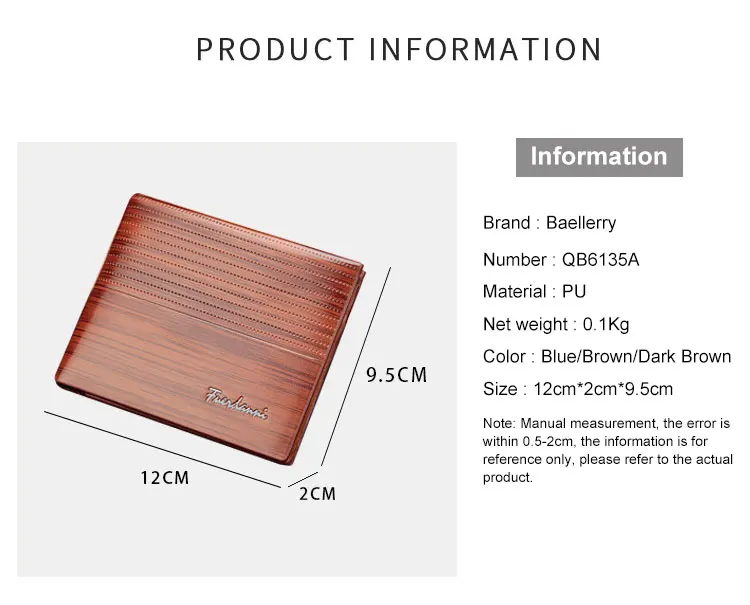 3. Длина кошелька-12 см (4,72 дюйма), ширина 9,5 см (3,74 дюйма) толщина составляет 2 см (0,78 дюйма)