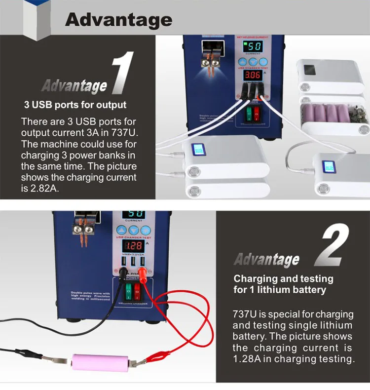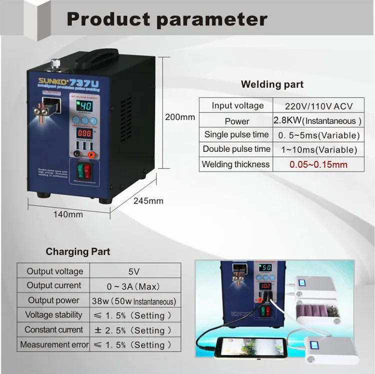 Сварочные части Мощность Напряжение питания: 220V/110vacv Мощность: 2.8kw Одиночный импульс время: 0,5-~ 5 мс (регулируется) Время двойного импульса: 1 ~ 10 мс (регулируется) Емкость сварки: 0,05 ~ 0,15 мм (никелевый лист) Зарядный силовой блок регулятора Выходное напряжение разъема USB: 5 В Выходной ток гнезда sb: 0-2 А (макс.) Терминал Выходное напряжение: 4,2 V Выходной ток терминала: 0-3 А (макс. Выходная мощность: 38 Вт (мгновенное 50 Вт) Стабильность напряжения: 1.5% (заданное значение) Точность постоянного тока: ± 2.5% (набор) Погрешность измерения: 1.5% (заданное значение)