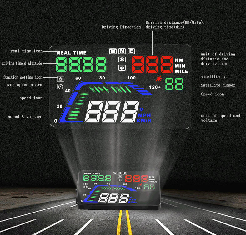 HUD short for Head Up Display.It displays driving datas on the front windshield such as speed, driving direction, clock, driving distance, and driving time on the car front window glass;avoiding drivers unsafety because of watching the instrument while driving.Drivers can read the driving information instantly , and can always keep the best state on the way with HUD.