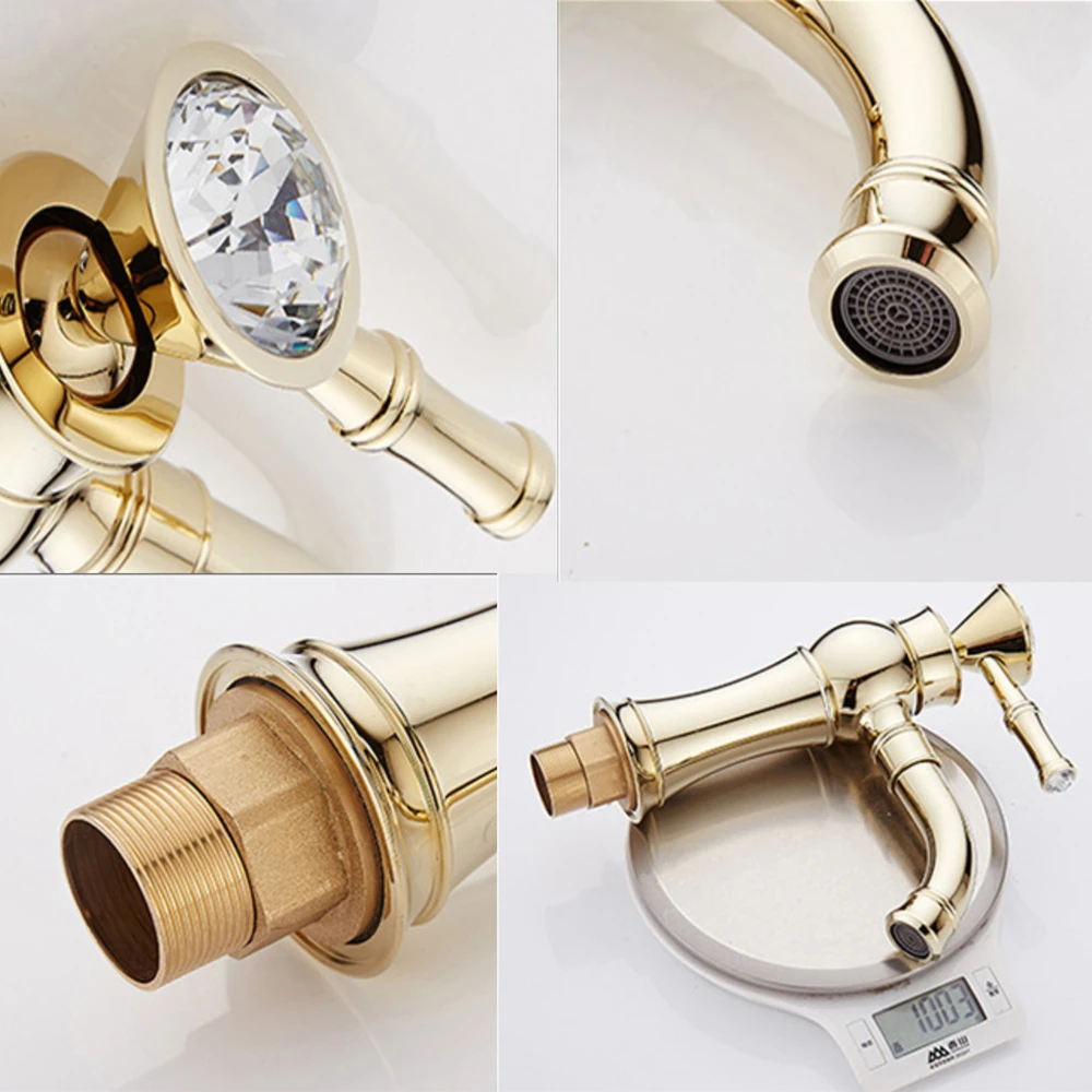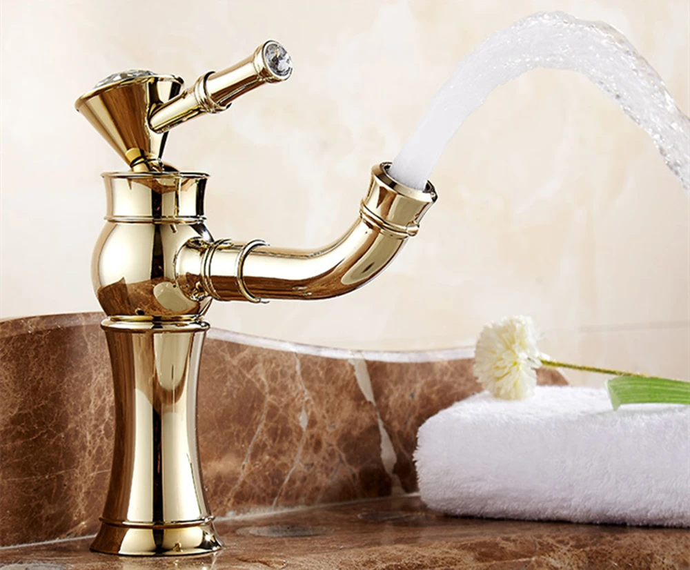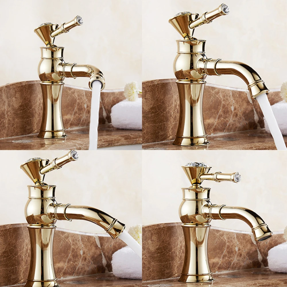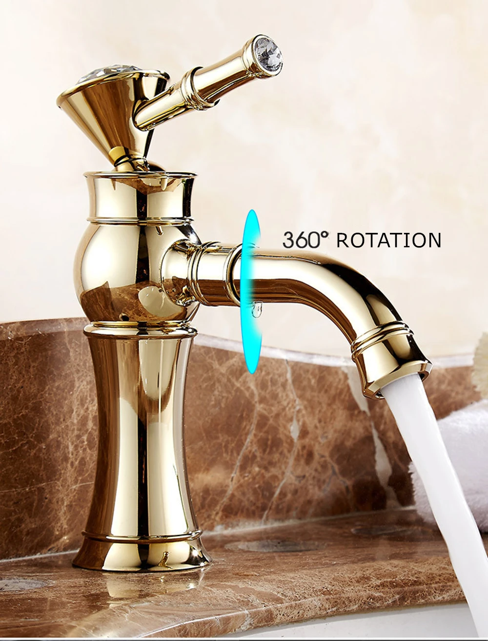 Зеркальный золотой кран для ванной комнаты, твердый латунный Смеситель для горячей и холодной воды, краны, полированные, на бортике, 360 градусов, вращающиеся краны