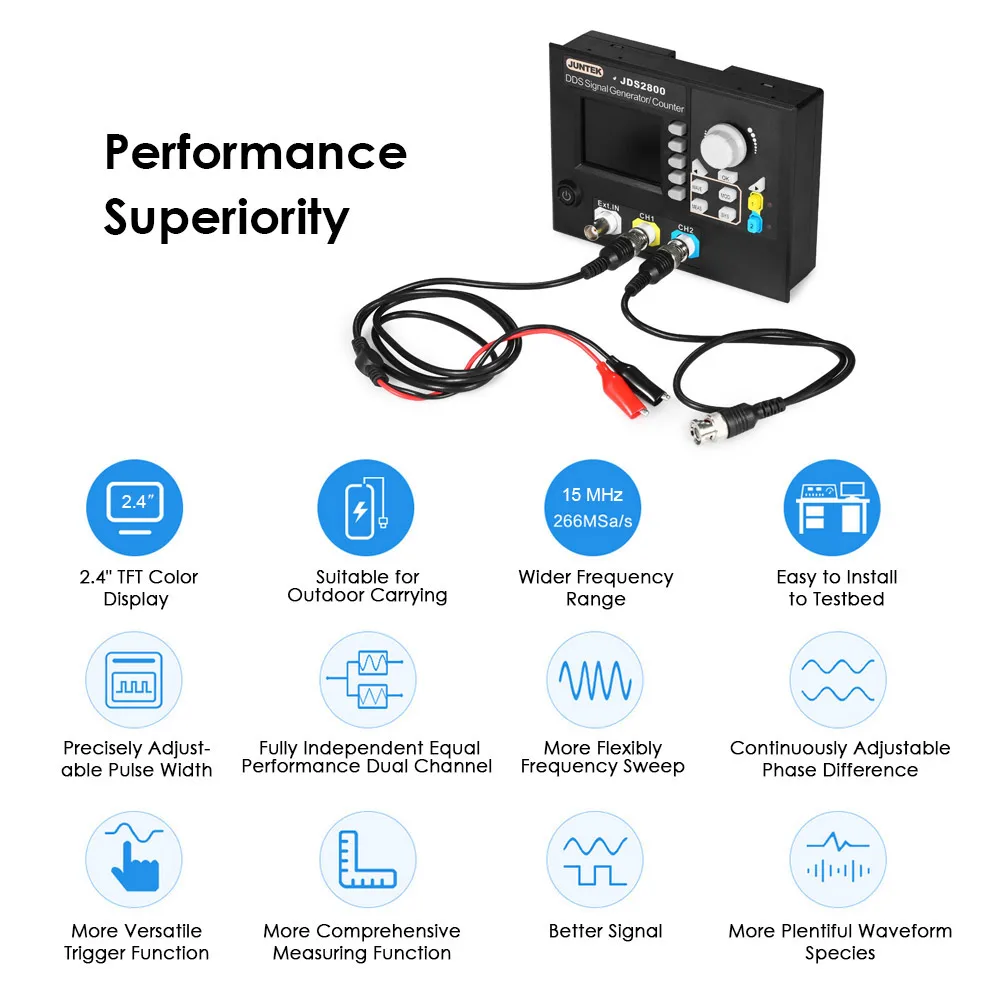 Двухканальный генератор сигналов серии JDS2800 сочетает в себе несколько функций в одном, таких как генератор функциональных сигналов, генератор произвольной формы, импульсный генератор, развертка, счетчик и частотный счетчик и т. д. прибор использует технологию прямого цифрового синтезатора (DDS) и обеспечивает стабильные, точные, чистые и низкие сигналы искажений. Это отличный испытательный или измерительный инструмент для инженеров электроники, электронной лаборатории, обучения и исследований.