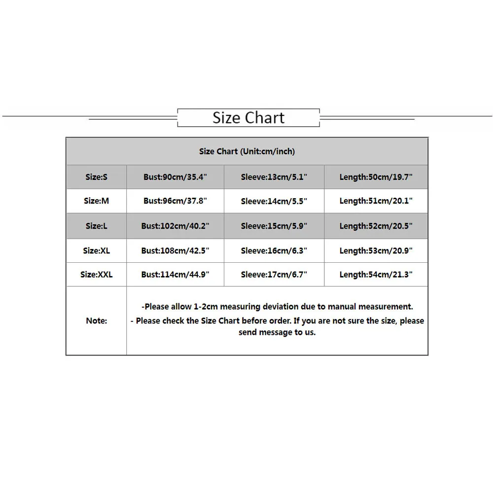 | Размер: XXL | Бюст: 114 см/44,9" | Рукав: 17 см/6,7 дюйма | Длина: 54 см/21,3" |
