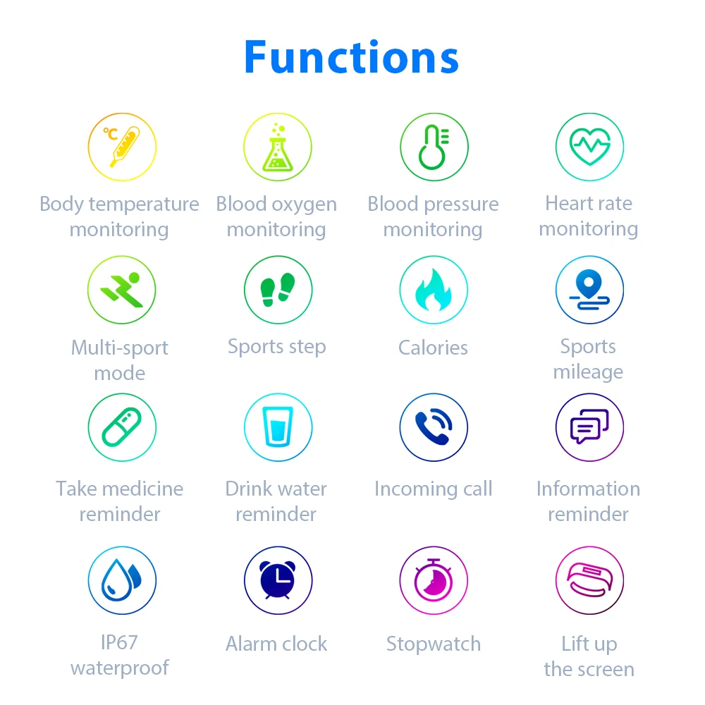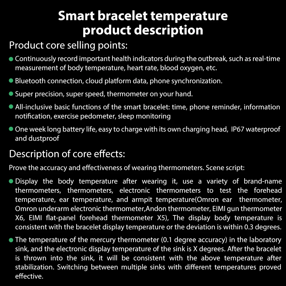 Устройство контроля в реальном времени: 24-часовой мониторинг в реальном времени сердечный ритм, измерять кровяное давление, оксиметр, научное руководство и здоровые упражнения, температурного обнаружения для высоких и низких температур, предупреждение.