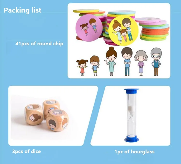 Product Informations: Weight:0.6kg Product Size:18.5*7*14cm Material: Wood Product Configuration: Round chip*41pcs Sand Timer*1pc Dice*3pcs Game manual*1pc Due to save shipping cost,it comes without the original box,if you want the box,pls contact me,thank you for your understand!!!!!!!