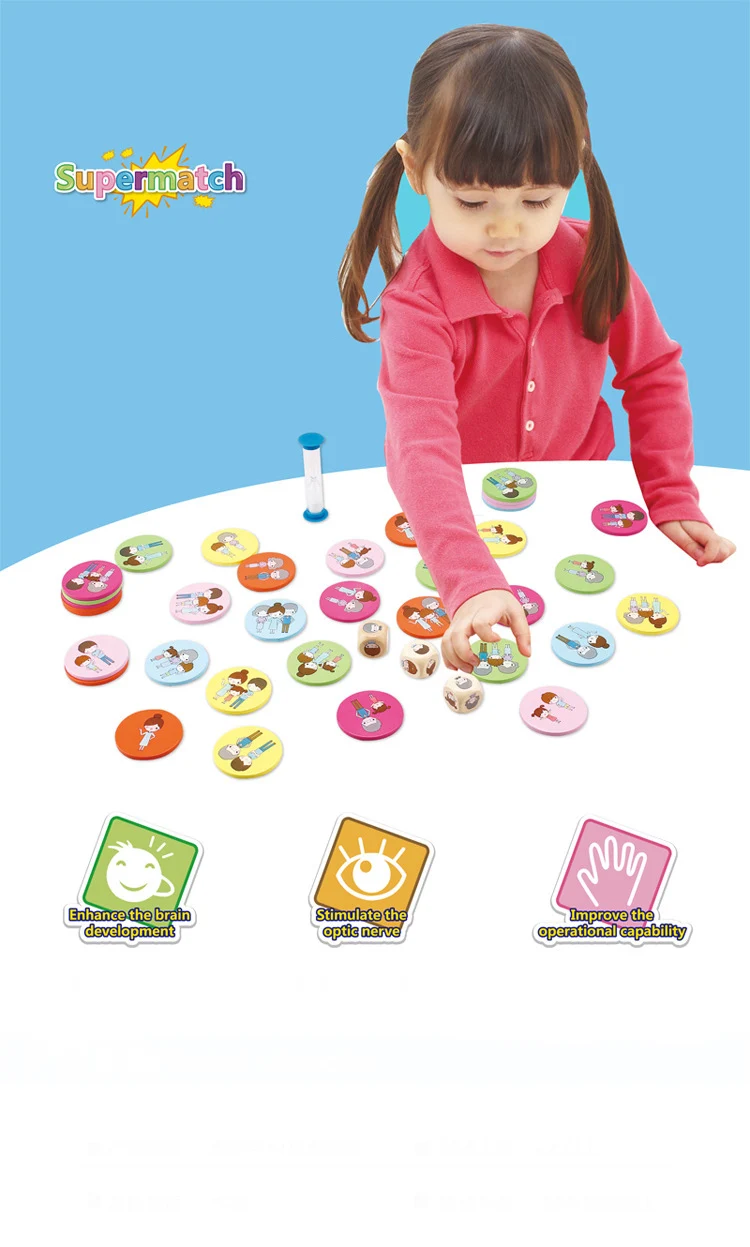 Game Description 1.For one player,try if you can well stack all round chip on the hourglass 2.For2/5players,each player throw three dices at same time,ther will have a character on each dice,player should check and match three characters quickly then find out the correct round chip within the time of hourglass.The one who find more chip will win the game!