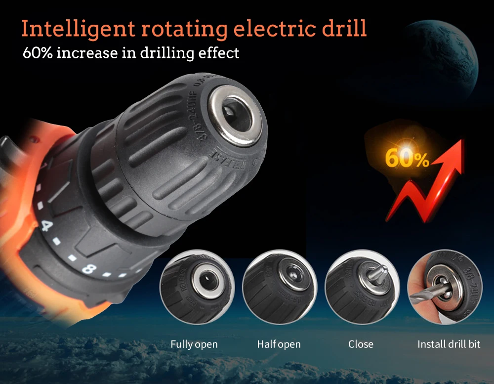 | Посылка содержание | 1 x электрическая дрель, 1 x набор батарей, 1 x Зарядное устройство, 2 x Пакетная головка |