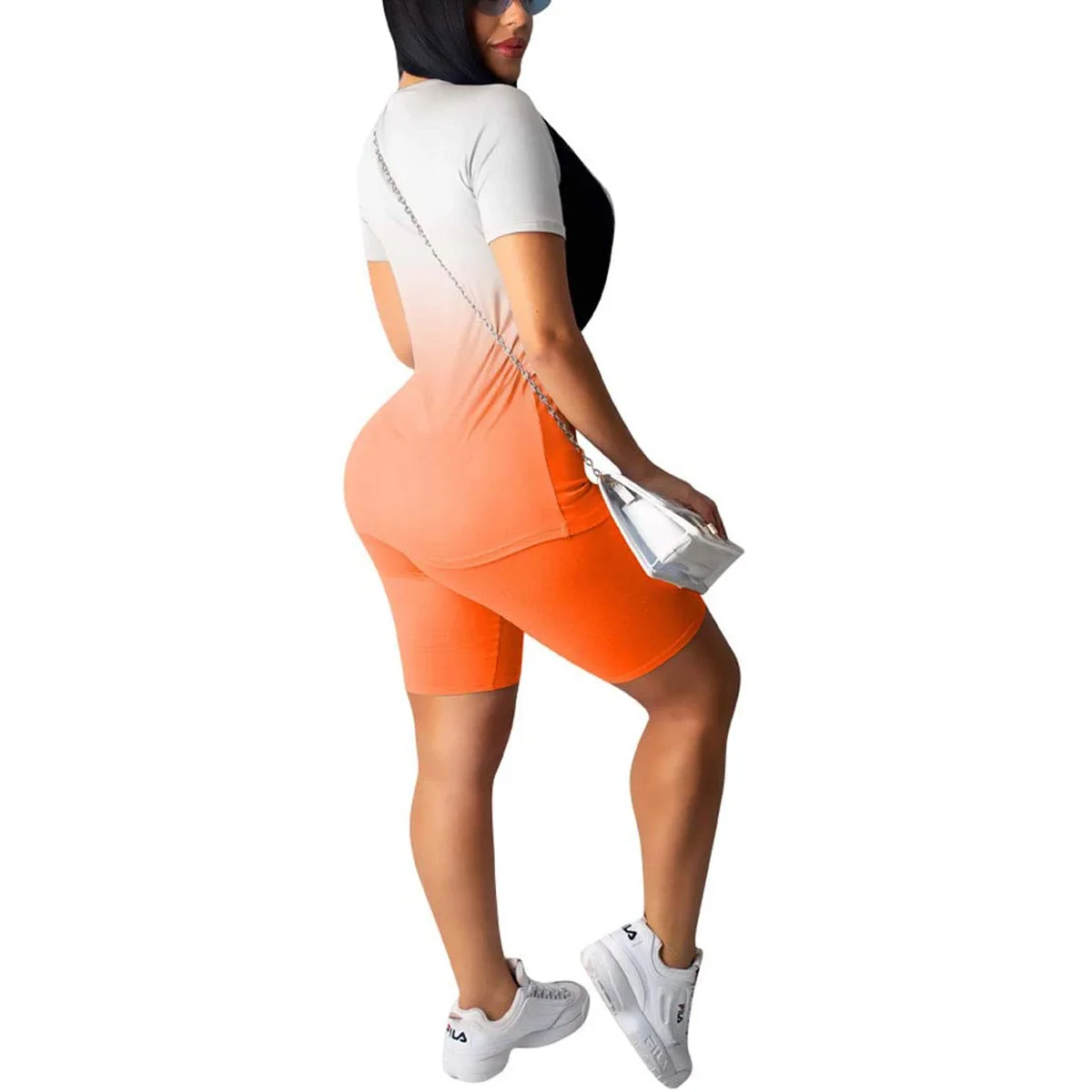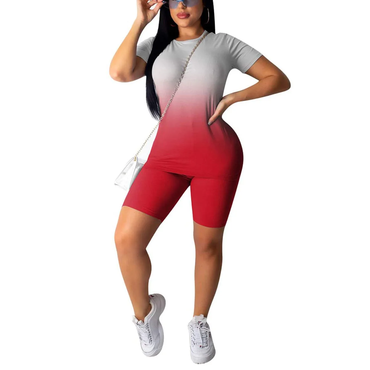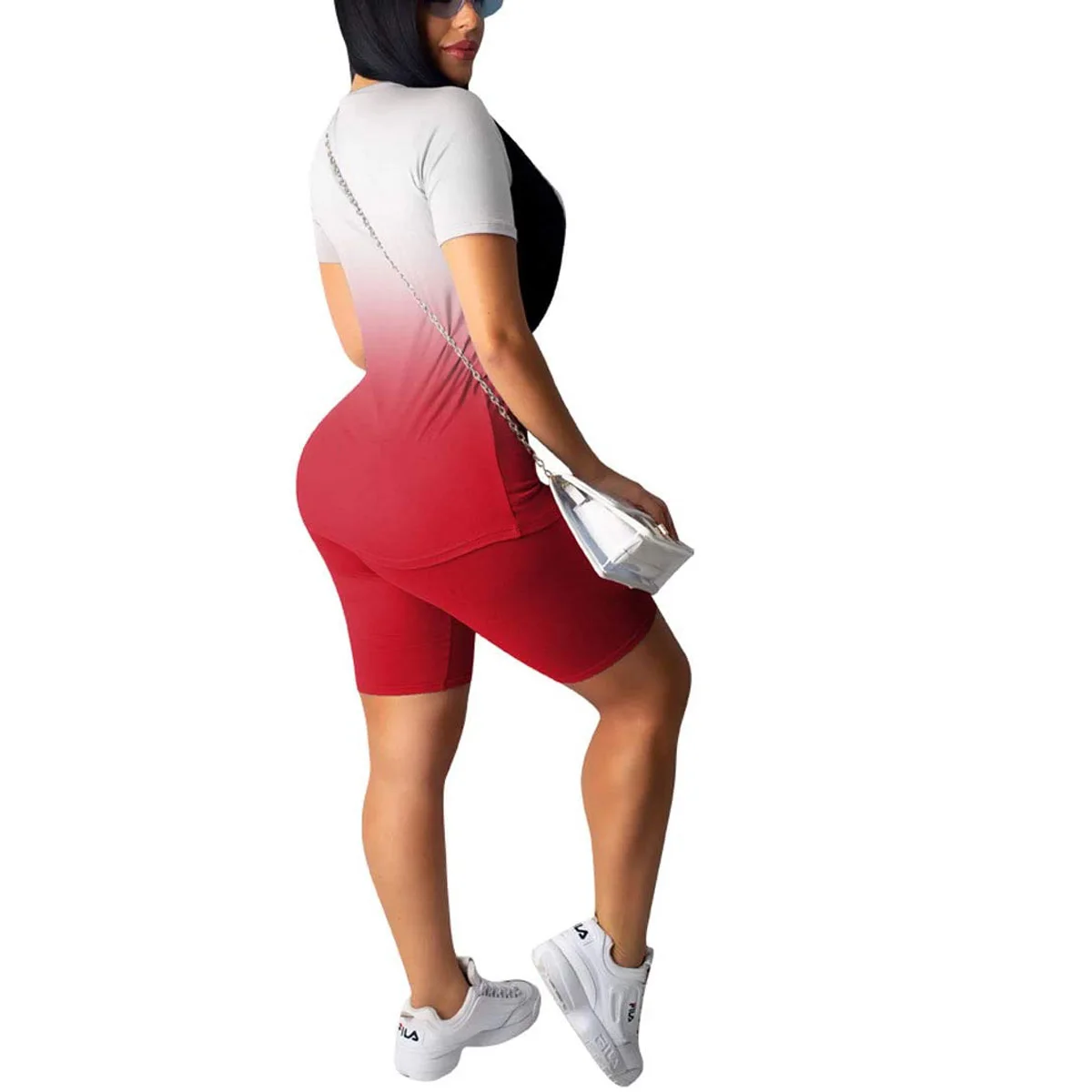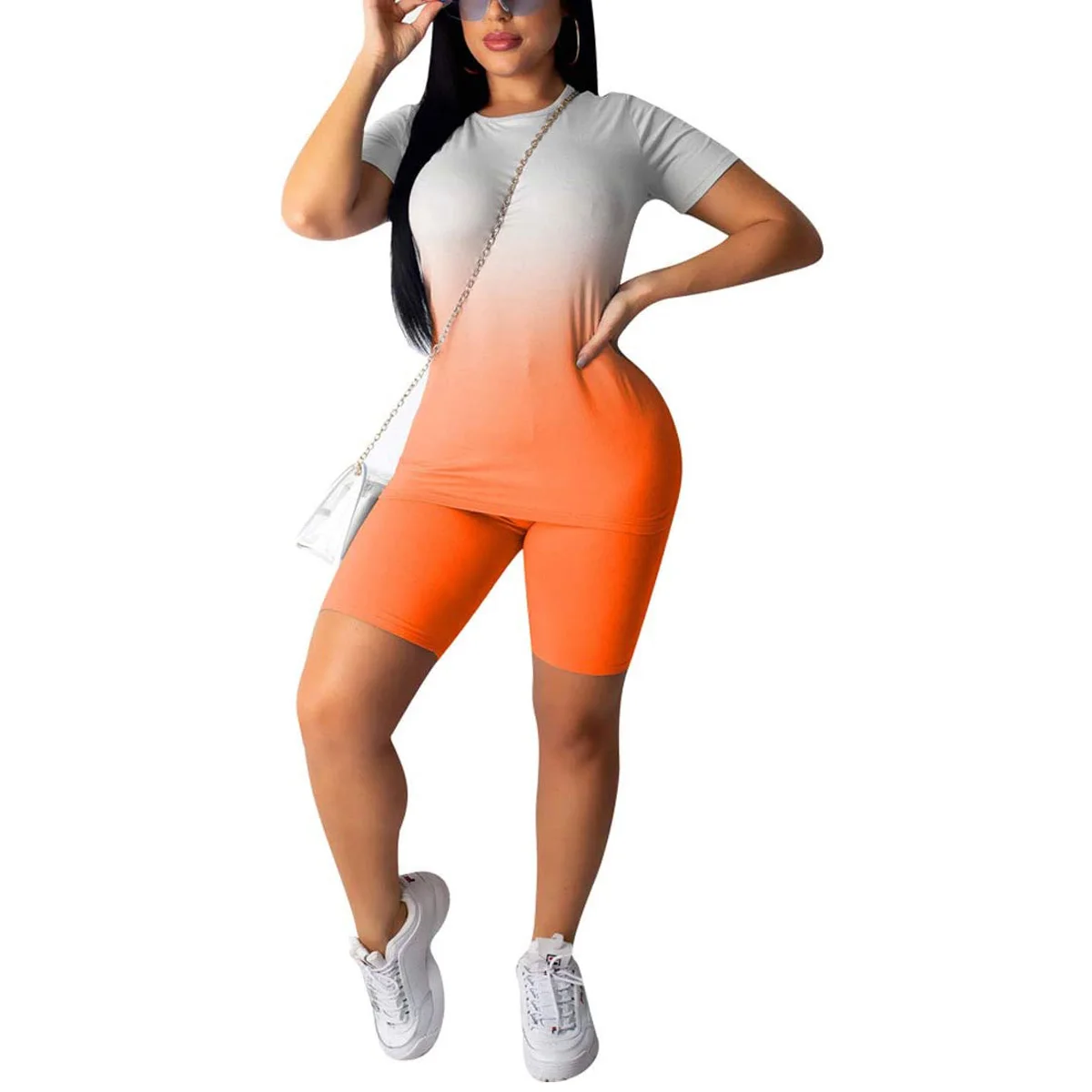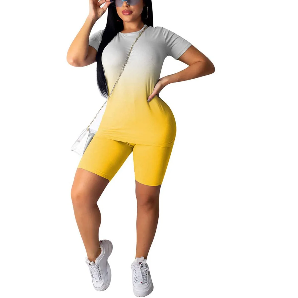 Женский спортивный комплект из 2 предметов с градиентным узором, короткий рукав, круглый вырез, Тонкий Топ, высокая талия, эластичная лента, короткие штаны, спортивный костюм