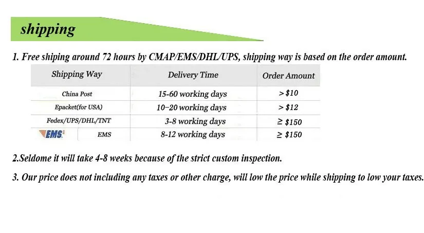 1. Мы отправляем все наши ИТ-ems по всему миру в течение 48 часов EMS/DHL/UPS или почтой Гонконга/Почта Китая, способ доставки будет зависеть от общей стоимости.