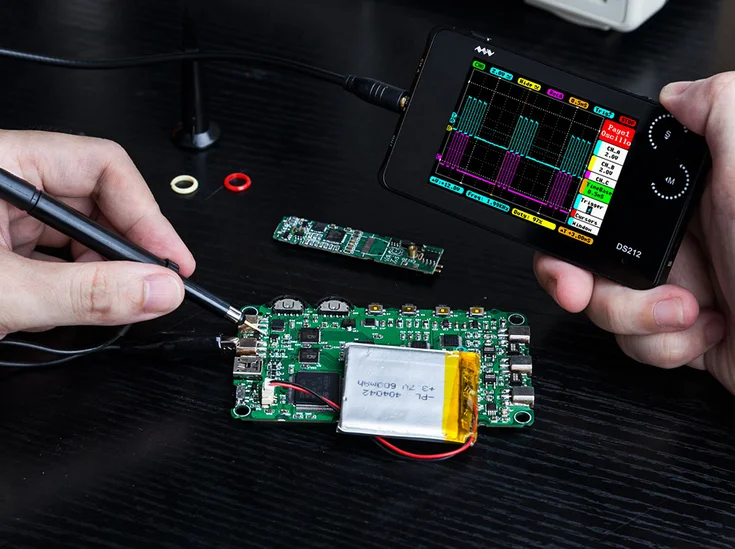 DS212 осциллографа. Частота дискретизации параметров производительности: 10MSA/s (макс.) Полоса пропускания сигнала аналогового канала: 1 МГц глубина дискретизации: 8K (макс.) Стандартное входное сопротивление аналогового канала: 1 м аналоговый канал Входное напряжение: + 40 в (Макс, X1 зонд) аналоговый канал входное соединение режим: AC/DC аналоговый канал Входная чувствительность диапазон: 20 мВ/див ~ 10 В/Див (1-2-5 шаг) основной диапазон горизонтального сканирования: 1uS/Div ~ 2S/Div (1-2-5 шаг) режим функциональных параметров: с автоматическим, нормальным, один, нет, режим синхронизации сканирования режим триггера: Режим триггера с подъемным/падающим краем настраиваемый режим: адаптивный горизонтальный, вертикальный диапазон, режим порога триггера может быть установлен сигнал измерения: Измеряемая частота сигнала/период/рабочий цикл, пиковый/RMS/максимальный/Минимальный/средний источник сигнала: Встроенный 10 Гц ~ 1 МГц квадратная волна (регулируемое соотношение пространства) или 10 Гц ~ 20 кГц аналоговый синусоидальный/треугольный/волновой тест источник сигнала Параметры продукта емкость хранения: Встроенный u-диск Емкость 8 Мб, может хранить данные сигнала и изображения сигнала Батарея: Встроенный литиевый аккумулятор емкостью 500 мА · ч, Заряжается от микро-usb порта: цветной TFT ЖК-дисплей (разрешение 320*240) Объем: весь объем тела (100 мм x 56,5 мм x 10,7 мм) Размер упаковки: 195 мм * 110 мм * 45 мм