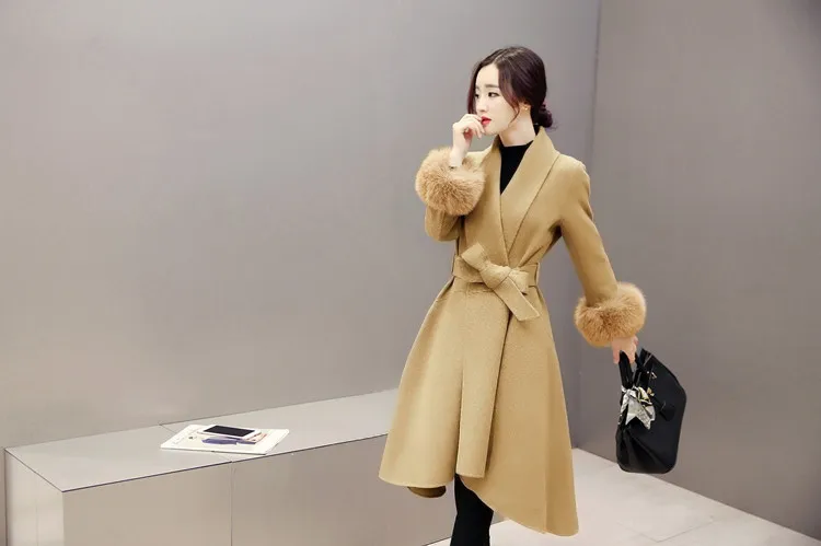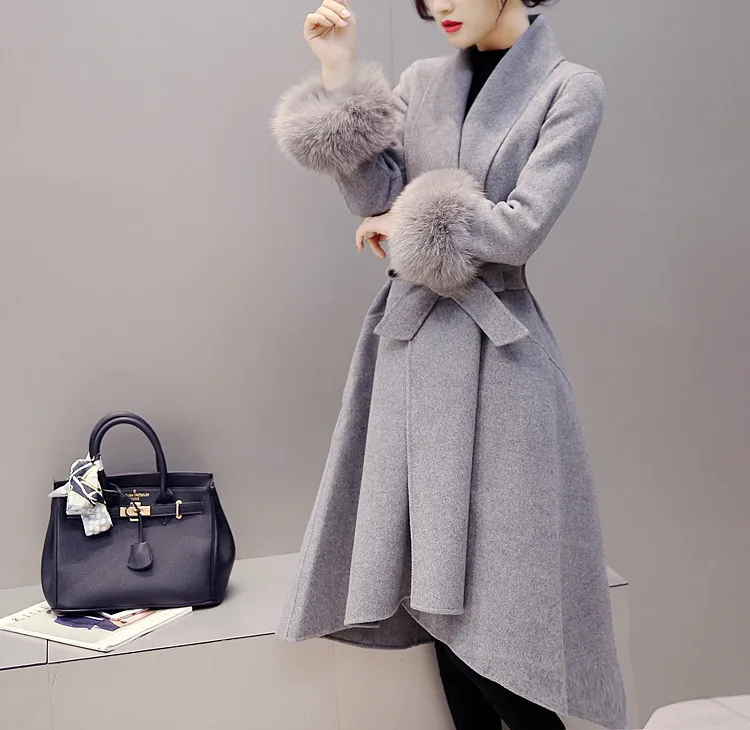 Шерстяное пальто, женское тонкое длинное пальто, повседневная шерстяная однотонная верхняя одежда с элегантным съемным воротником, меховое пальто, модное женское пальто, большие размеры