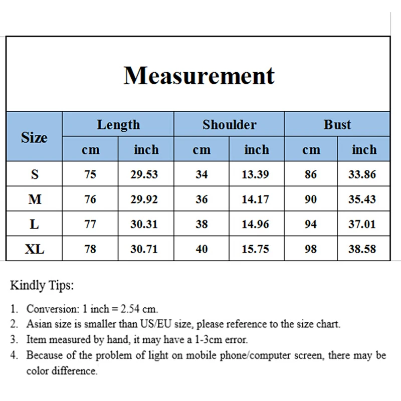 Особенности: 1 см = 0,393 дюйма, 1 дюйм = 2,54 см Размер: длина, обхват груди, ширина плеч M: 76 см x 90 см 36 см L: 77 см 94 см 38 см Размер XL: 78 см 98 см 40 см | ||||||