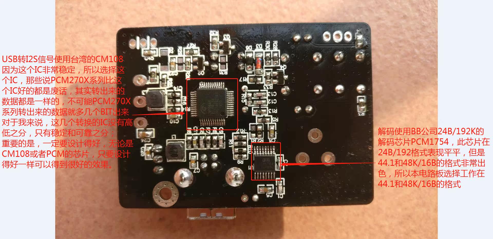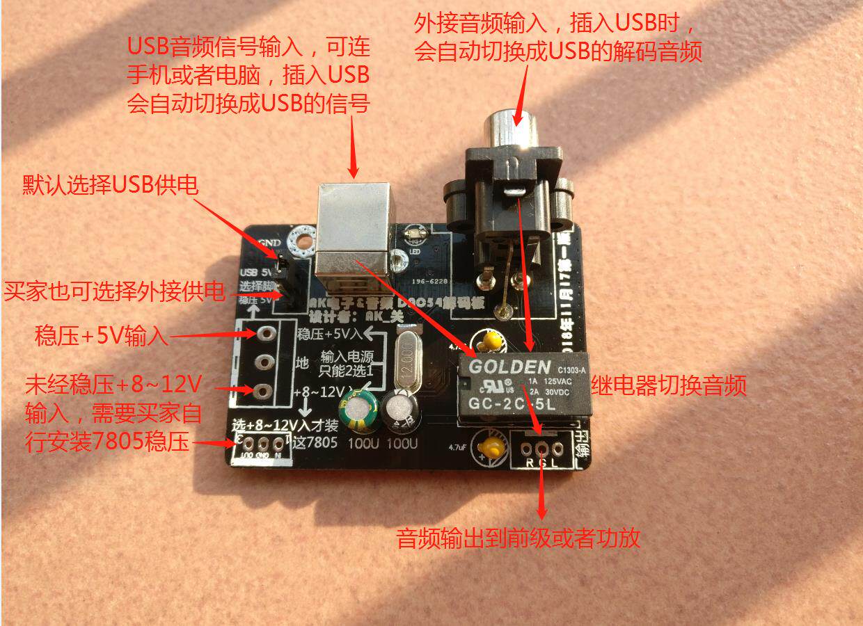 Использование CM108 в качестве usb-входа, декодирование с помощью BB компании 24B/192 K декодирование чип PCM1754 в качестве декодирования, fever design fever материалы, более удобно для игроков модифицировать и модернизировать, эта плата может быть установлена на передней панели или усилителе для переключения звука.