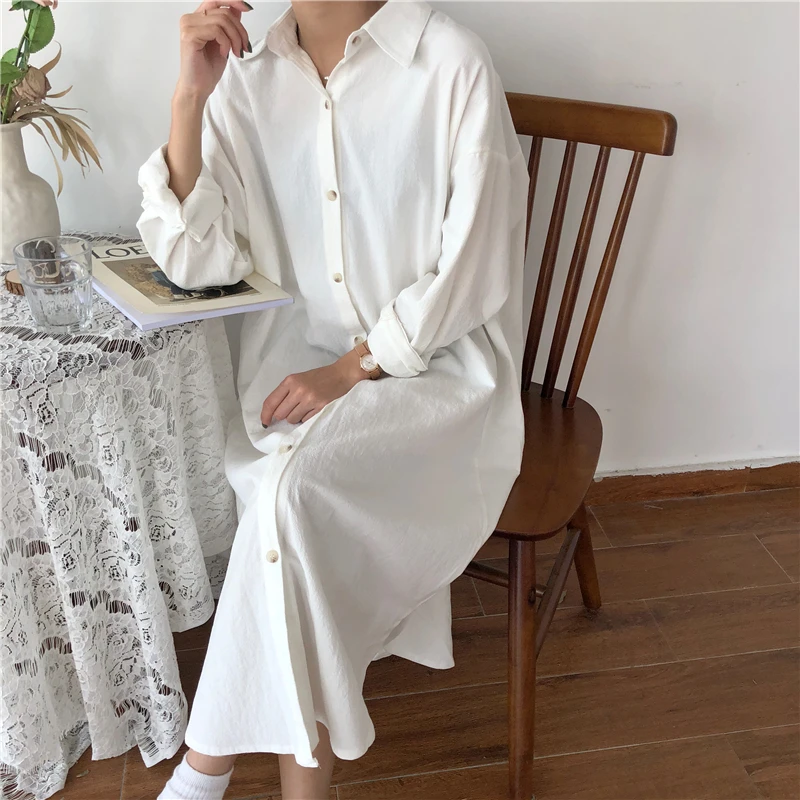 Винтажное осеннее длинное платье с длинным рукавом, рубашка с отложным воротником, женская Свободная рубашка, длинное платье из хлопка, голубое, белое, DC115 <