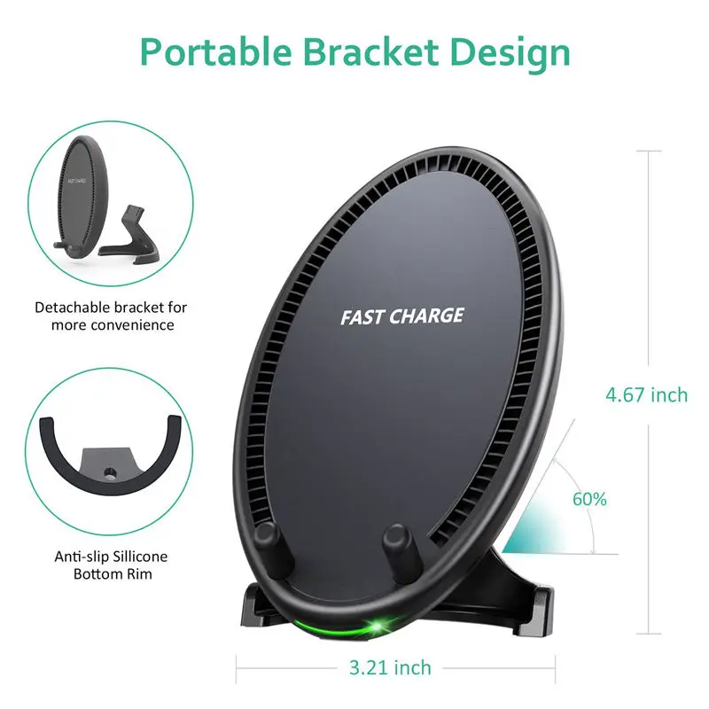 Быстрое беспроводное зарядное устройство QI: оснащено технологией беспроводной зарядки QI, это Беспроводное зарядное устройство мощностью 10 Вт, зарядка ваших смартфонов и других устройств, совместимых с QI, быстрее, чем беспроводные зарядные устройства 5 Вт. Без нагрузки подключить устройство к настенному зарядному устройству или адаптеру USB.