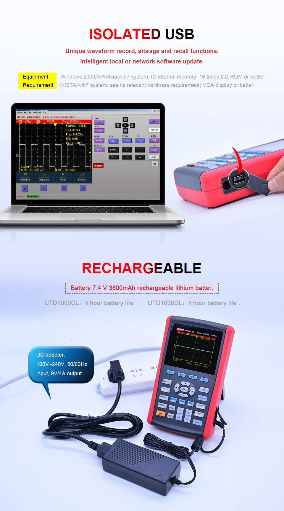 6. Батарея 7,4 V 3600mAh перезаряжаемая литиевая батарея.UTD1000CL:8 часов работы от аккумулятора, UTD1000DL:8 часов работы от аккумулятора.