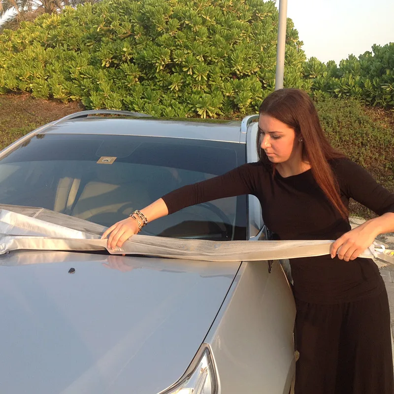 Металлизированная светоотражающая ткань обеспечивает прочный щит от уф, тепла, пыли... двойные Серебристые слои покрытия металлический порошок, покрывающие слой высококачественной полиэфирной ткани. Уникальная запатентованная технология! 2 слоя металла порошок сверху обеспечивает UV-REFLECTION 82-84% По сравнению с обычным зеркалом. Ткань 97% водостойкая и 3% Дышащий. изготовлен в дубае. Не подходит для пикапов или спортивных автомобилей