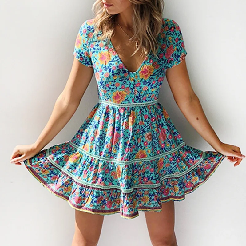 Женское пляжное платье с v-образным вырезом и цветочным принтом Wipalo, повседневное мини-платье трапециевидной формы с короткими рукавами, праздничное платье большого размера