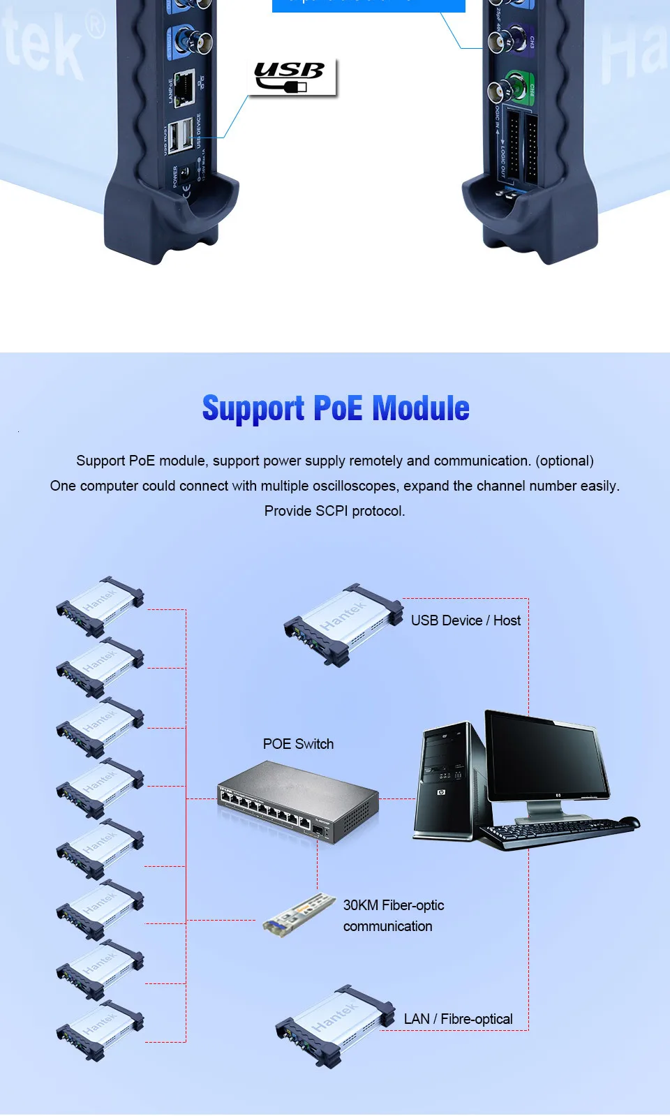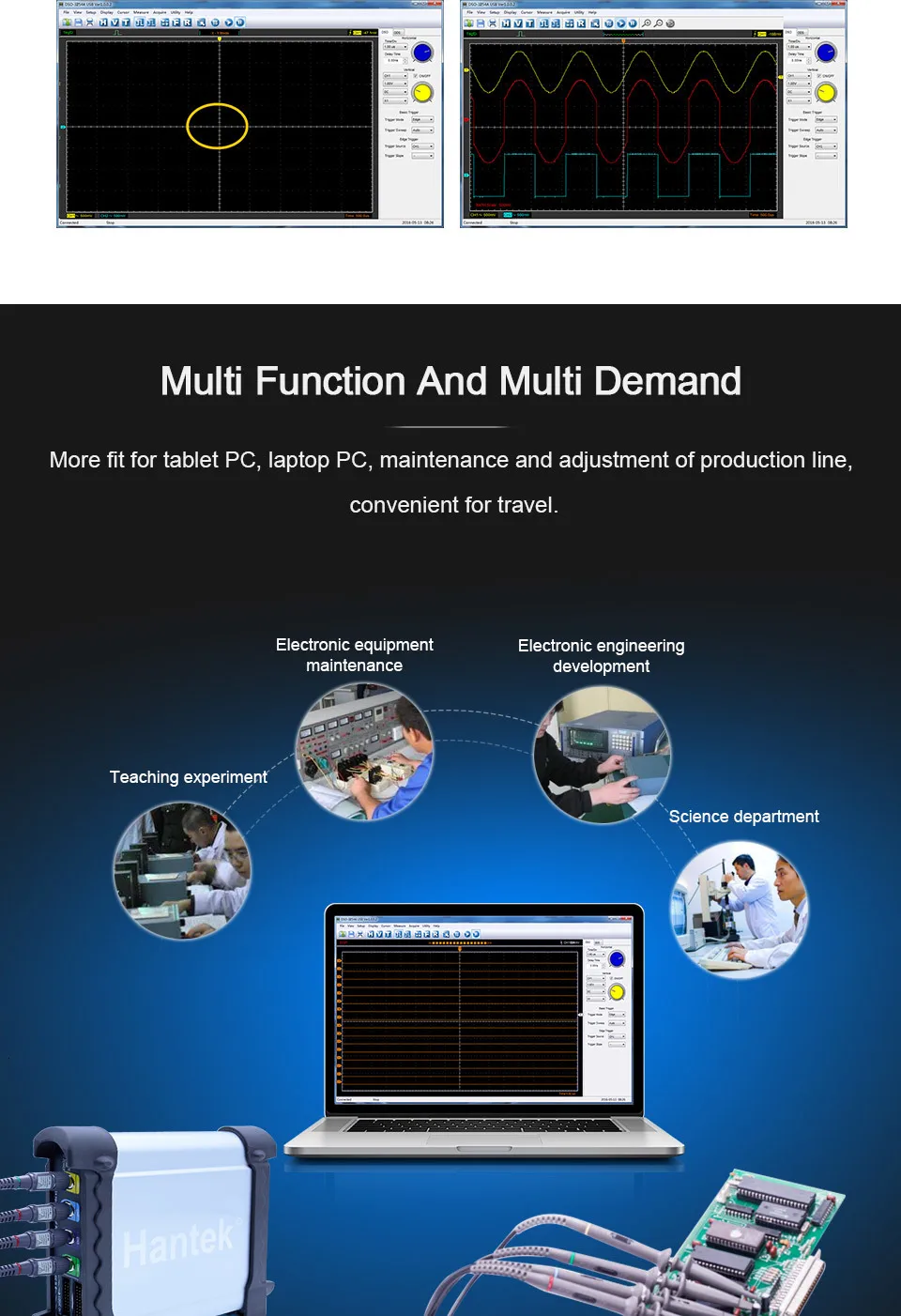 Его производительность может конкурировать с benchtop осциллографом, 4 независимых аналоговых канала, 1GSa/s высокоскоростная частота дискретизации в реальном времени, 1 мВ-10 В/див Высокая чувствительность на входе, высокая пропускная способность 250 МГц.