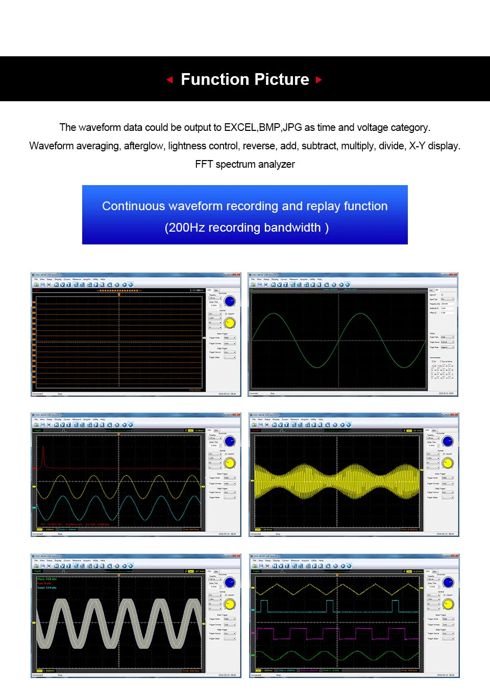 Пройти/сбой тест, богатый триггер функции, динамическое отслеживание курсора, аналогичный интерфейс с скамейкой осциллографа, простой в использовании. Высокая эффективность затрат.
