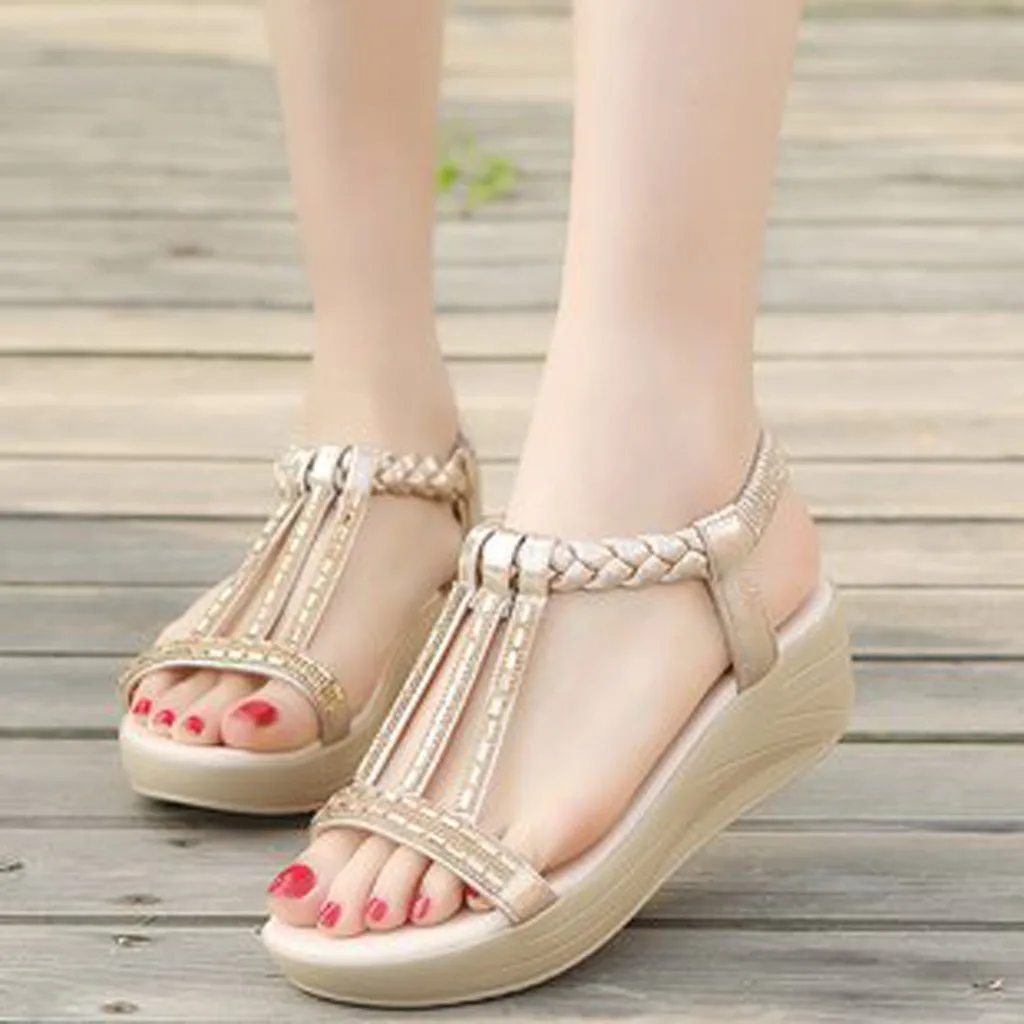 Для женщин летние модные стразы сандалии на танкетке на платформе в римском стиле открытый носок; босоножки