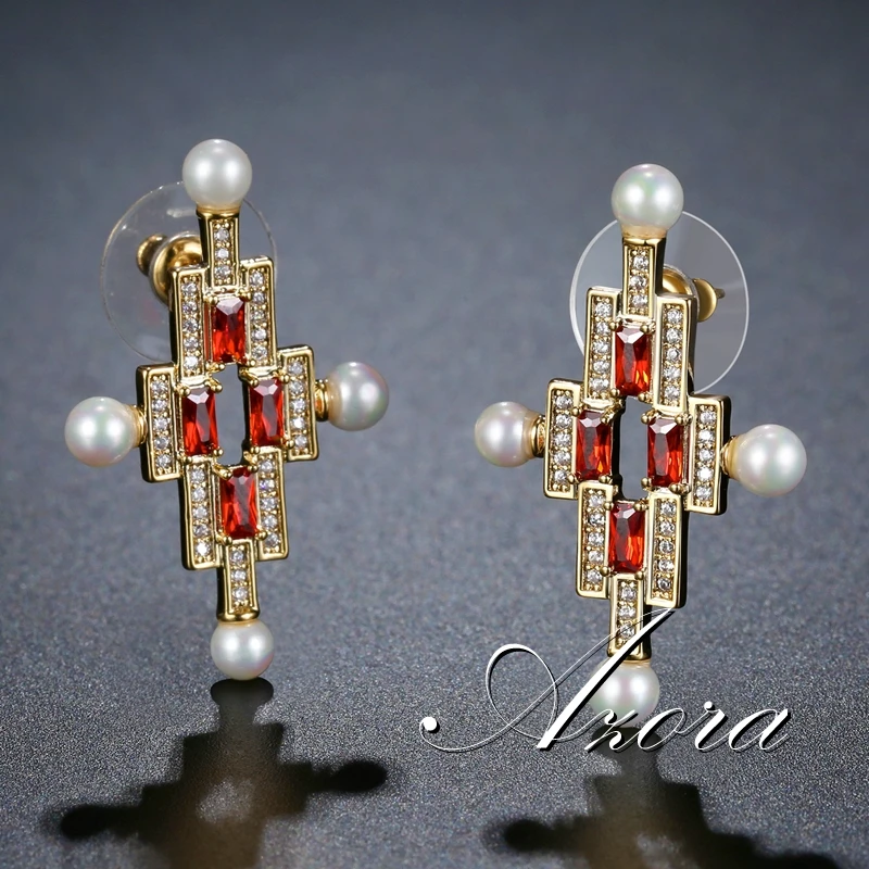 Женские жемчужные серьги-гвоздики AZORA, роскошные вечерние серьги с красным фианитом, ювелирные украшения TE0387