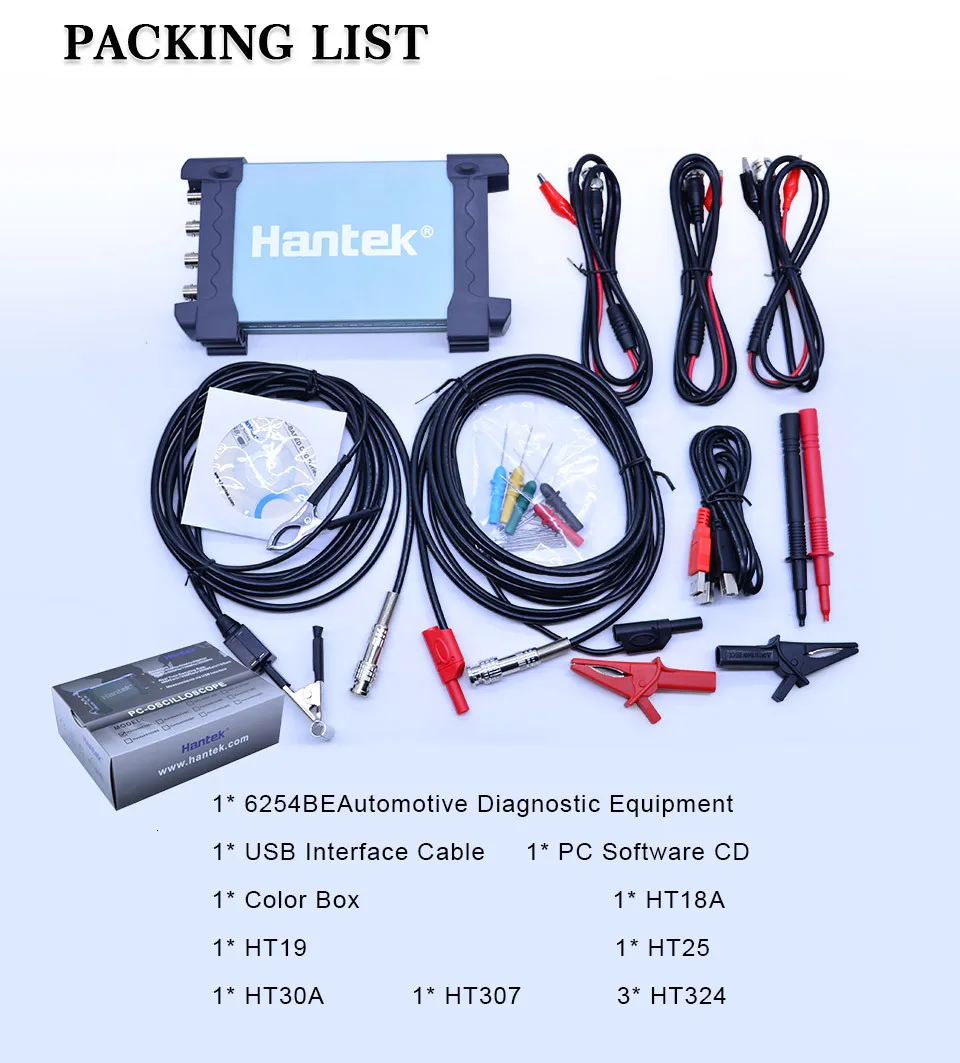 HT307 * 1,HT19 * 1,HT18A * 1,HT30A * 1, Зажим Аллигатор линии HT324 * 3,HT25 * 1,USB,CD, руководство