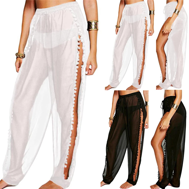 Сексуальные женские пляжные накидки сетчатые прозрачные широкие брюки шифоновые Повседневные прозрачные женские бикини Cover Up черный белый