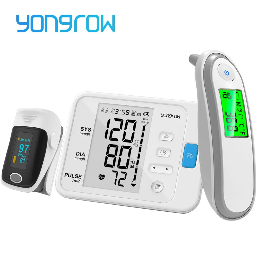 Посылка включает: Один Пальчиковый Пульсоксиметр + один монитор артериального давления на руку (Розничная коробка посылка) + один инфракрасный термометр для тела