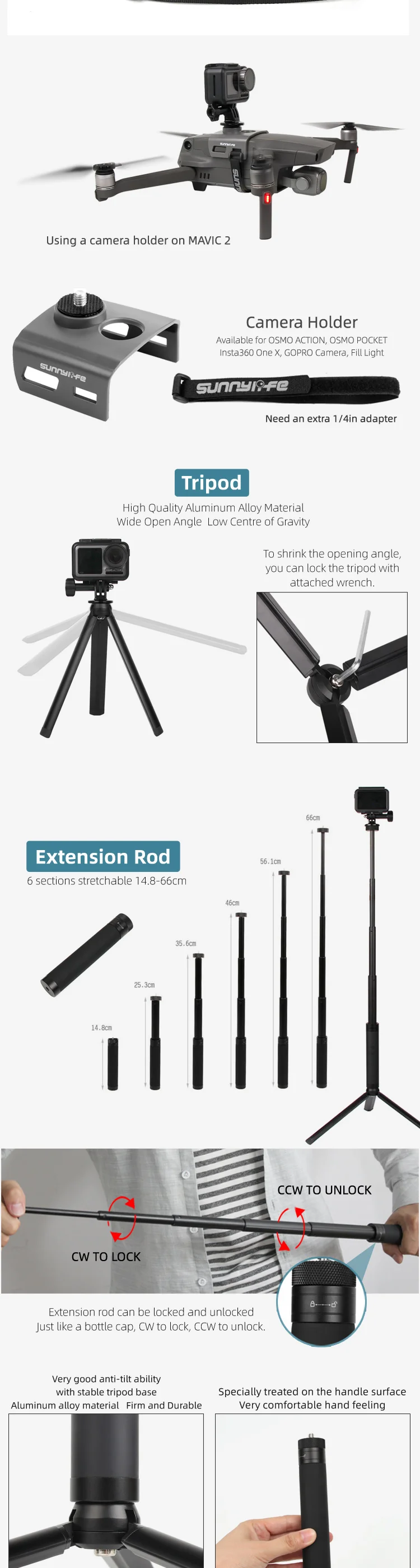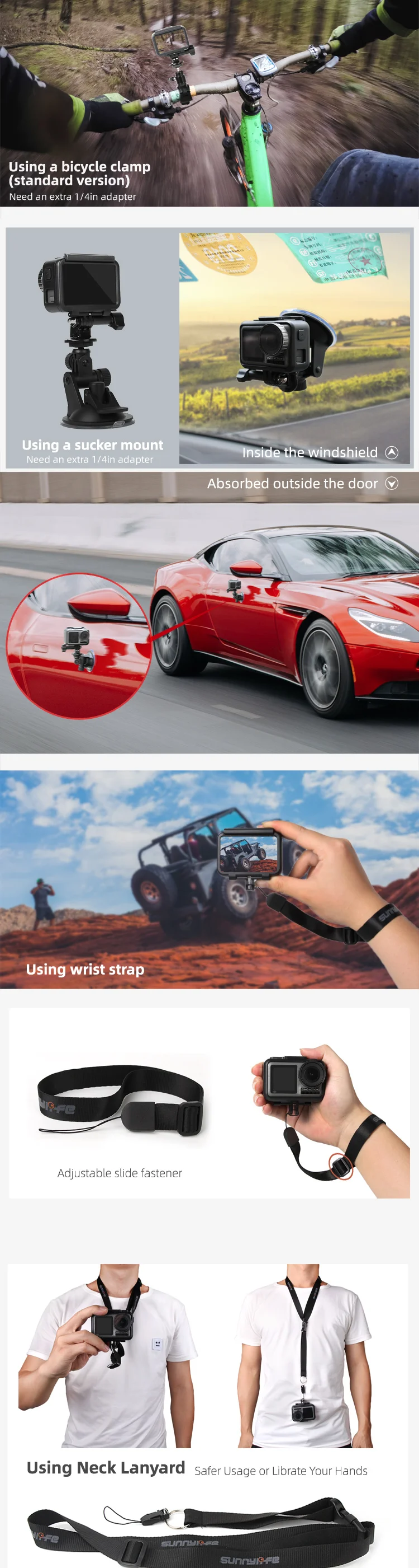 Адаптеры для DJI OSMO ACTION и GoPro Hero 5/6/7/8 Max Различные адаптеры для различных ситуаций. С рамой для камеры, OSMO ACTION может подключать зажим для рюкзака, головную ленту, нагрудную ленту, запястье, наручный ремень, шейный ремешок; 1/4in адаптер используется для деталей с 1/4in винт только. С 1/4in адаптер переменного тока, OSMO действие может подключаться к штатив, расширение стержня, велосипед, зажимы, присоска для крепления в автомобиле, держатель камеры на mavic 2.
