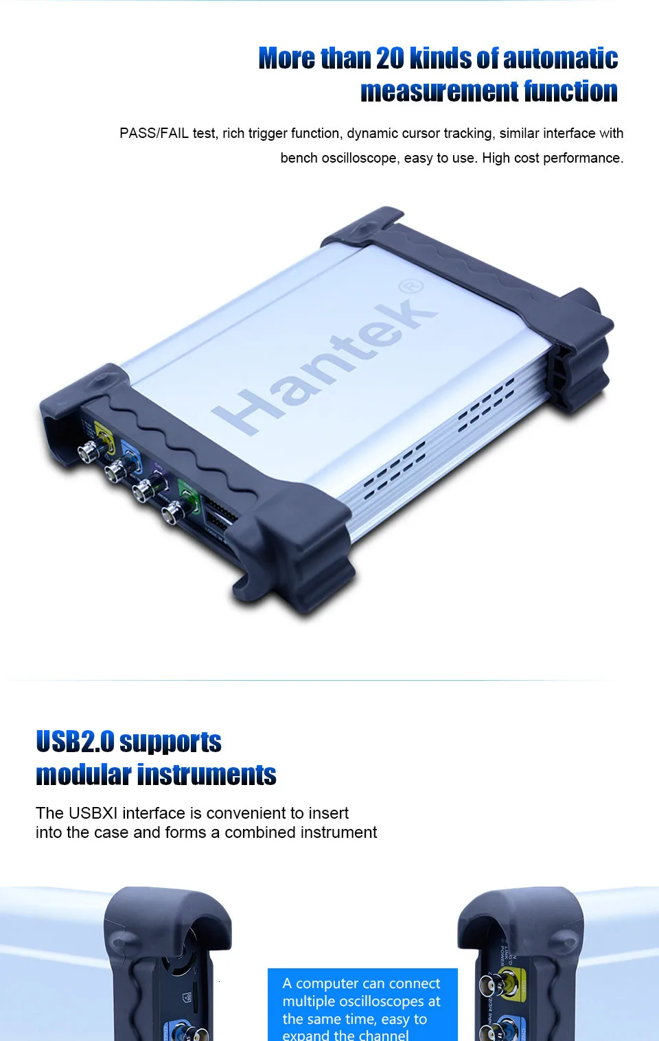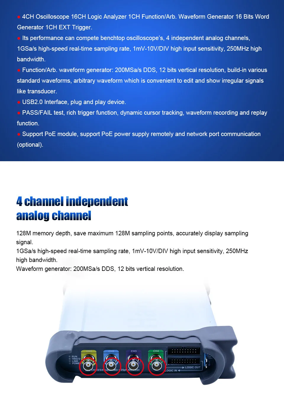 Его производительность может конкурировать с benchtop осциллографом, 4 независимых аналоговых канала, 1GSa/s высокоскоростная частота дискретизации в реальном времени, 1 мВ-10 В/див Высокая чувствительность на входе, высокая пропускная способность 250 МГц.