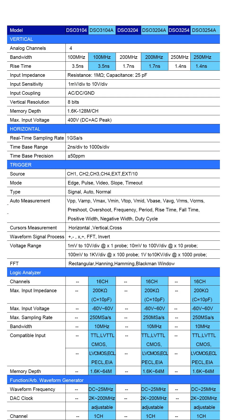 4CH осциллограф + 16CH логический анализатор + 1CH функция/Arb. Генератор сигналов + 16 бит слово Генератор + 1CH EXT механизм запуска.Глубина памяти 128 м, экономит Максимум 128 м точек выборки, точно отображает сигнал выборки.