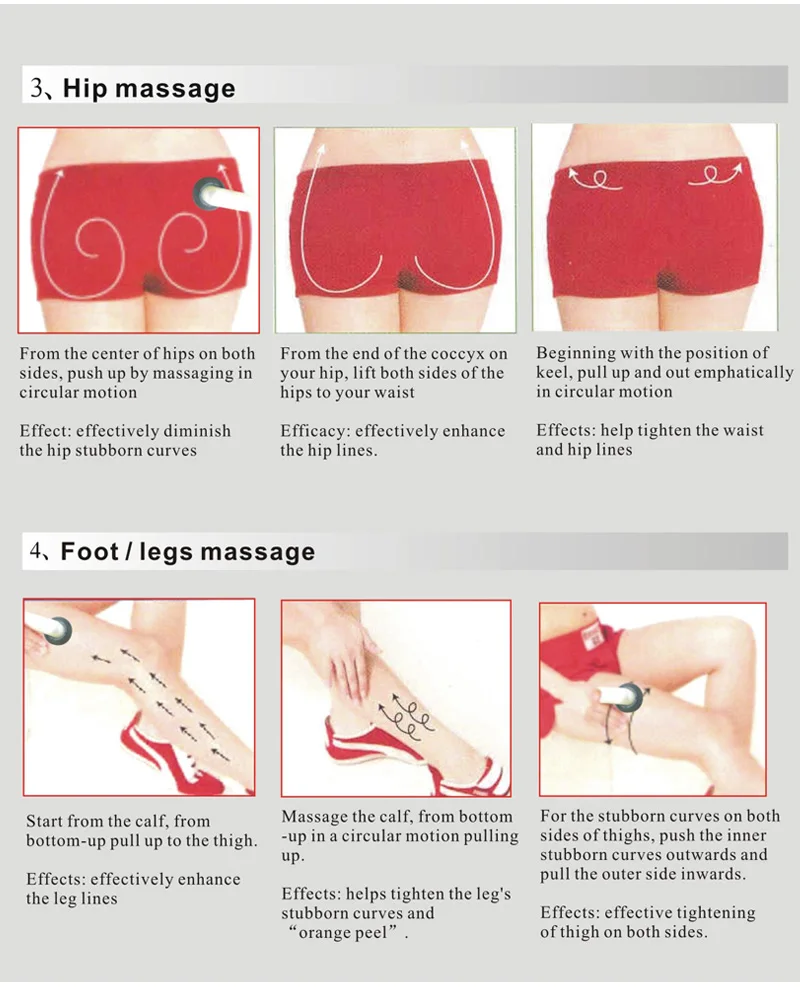 3. Массаж бедер От центра по бедрам на обоих с даты окончания срока действия копчик по бокам, Push-up по массажировать в ваше бедро, лифт обе стороны круговой motion бедра, учитывая обхват талии Эффект: эффективно уменьшает эффективность: эффективно улучшает упрямые кривые бедер. 4. Массаж ног/ног Начиная с положения киля, вытягивайте и вытягивайте с силой кругового движения Эффекты: помогает затянуть линии талии и бедер Начните с икры, от массажа икры, от низа для прямых изгибов на обоих днях-вверх до бедра. -Вверх в круговом движении, вытягивая стороны бедер, нажмите на внутреннюю Или похода по магазинам. Упорные изгибы наружу и эффекты: эффективно увеличивают вытягивание внешней стороны внутрь. Эффекты линий ног: помогает затянуть ногу Упрямые изгибы и эффекты: эффективное затягивание апельсиновой кожуры бедра с обеих сторон.